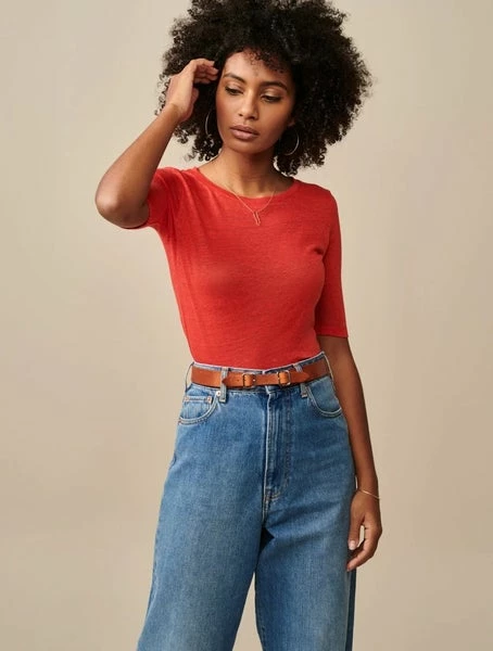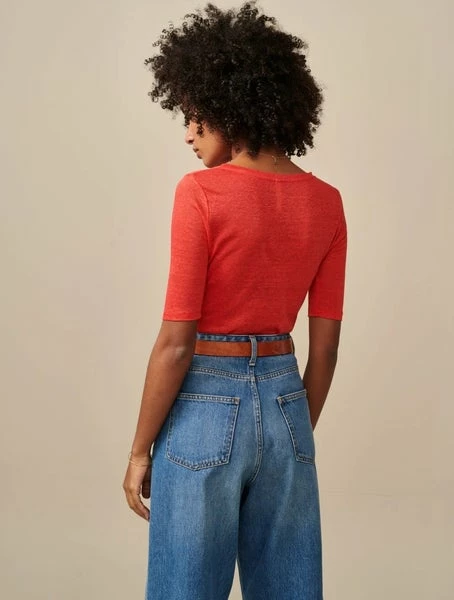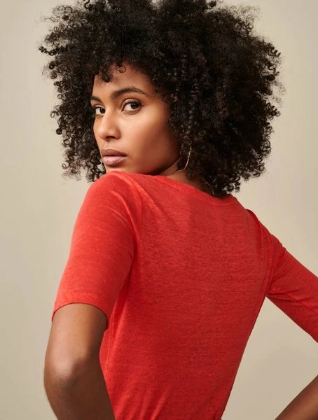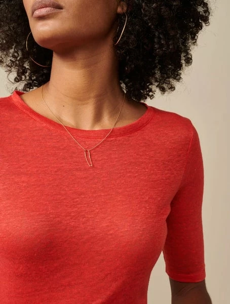 Linen love. A basic in our collections since back when dinosaurs were still a thing. All the comfort you need, with a slimmer fitting shape, boat neck, elbow-length sleeves and, of course, that light and breezy linen fabric. Please note that linen is quite fragile, we suggest you wash these in a lingerie bag. Slim fit t-shirt 100% linen Scooped neckline Above the elbow sleeves Comes in different colors