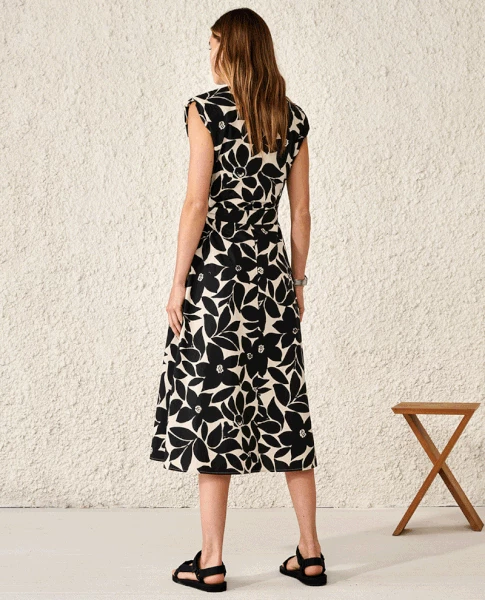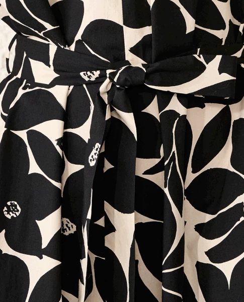 Bellerose Aku Dress, a black and off white floral print midi dress with capped short sleeves and a tonal waist belt. Covered in an eye-catching black flowery print the Aku midi dress is crafted from soft cotton. 100% Cotton Machine wash at 30 Fits true to size