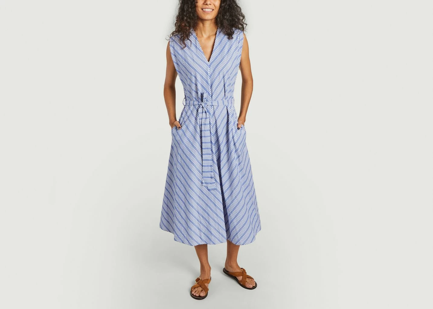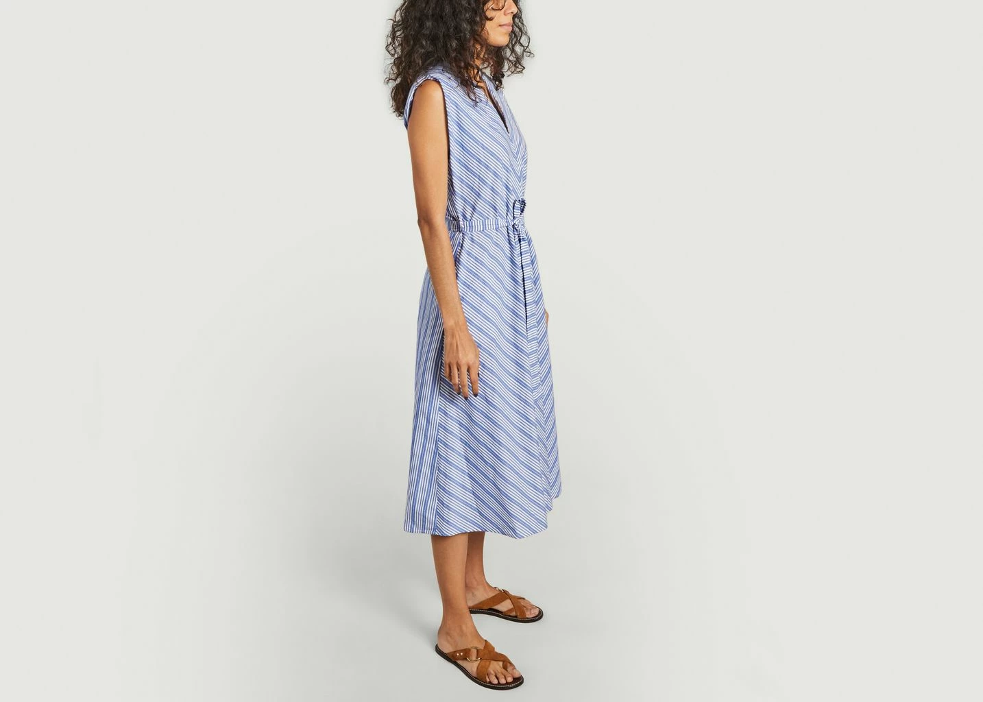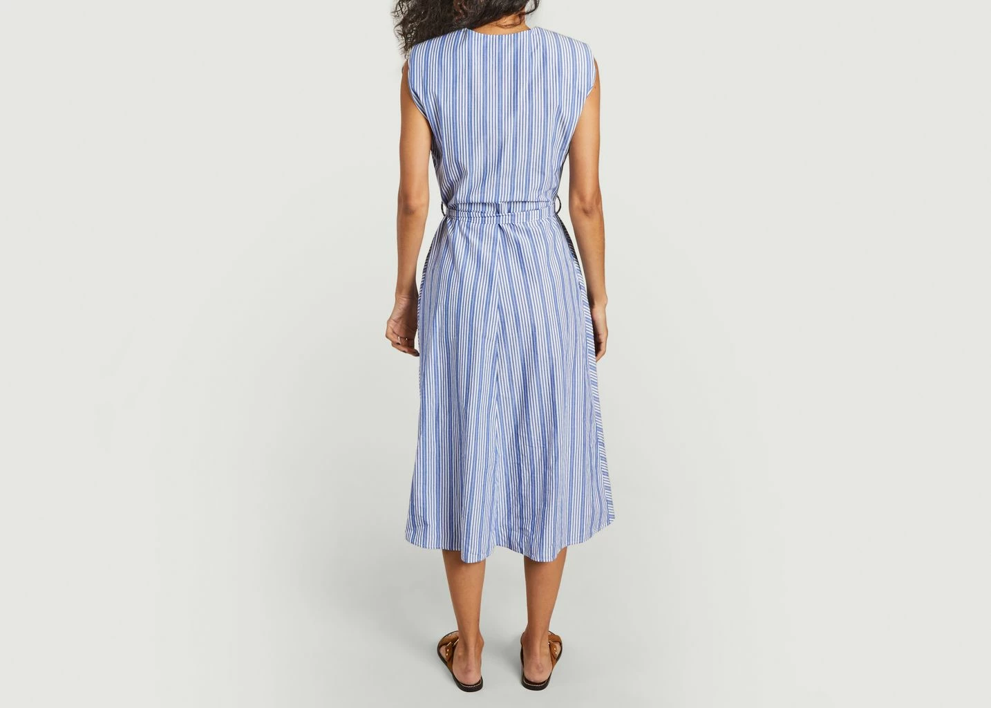 Long striped dress with exaggerated shoulders, 100% cotton, deep V neckline, matching belt, trapeze shape, dropped at the knees. We love the Aku dress by Bellerose, a must-have for the modern wardrobe. It stands out with exaggerated shoulders that contrast with the more refined and classic line of this long dress. Its fitted waist highlighted with a matching belt balances the angular line of the shoulders and the large V neckline. Wear it with a pair of sandals or sneakers for a very trendy city look.