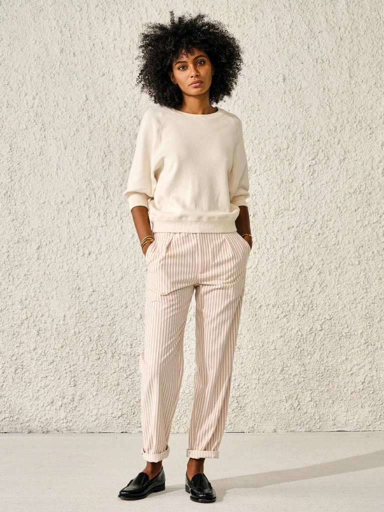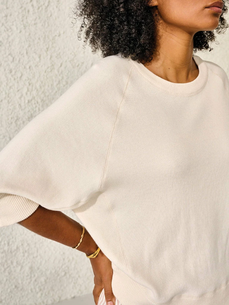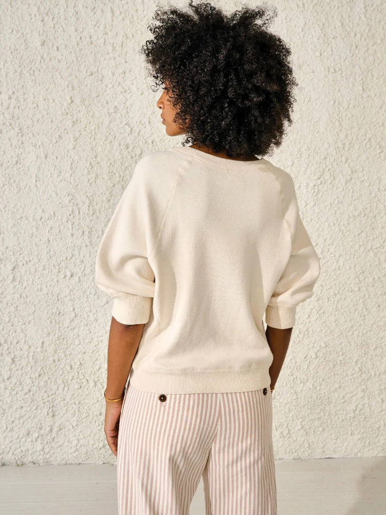 The Anglet Knit from Bellerose is a jersey sweatshirt with a wide round neck and 3/4 length sleeves. Loose and slouchy, the sweater is finished with ribbed trims. 100% Cotton Loose sweatshirt with 3/4 sleeves Loose and slouchy fit Ribbed trims Machine wash at 30