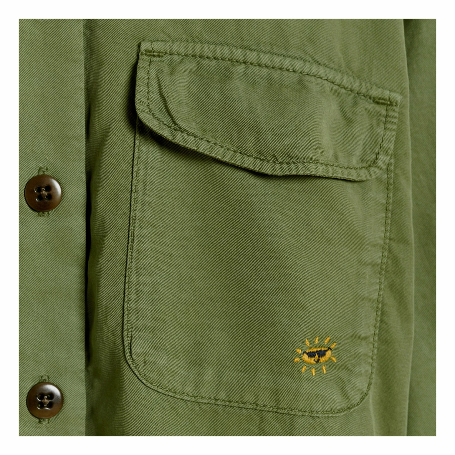 Fabrics :65% lyocell, 35% cotton Details : Rounded Peter Pan collar, Rounded front panels, Slightly longer on the back,Two flap pockets on the chest Size of photographed item: 10 years Colour: Army