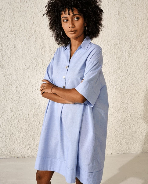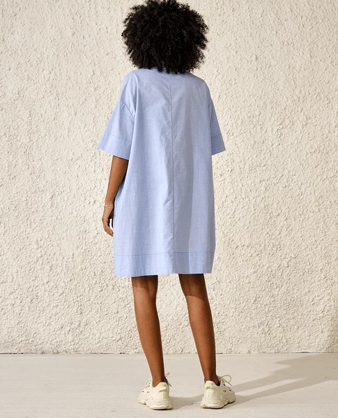 Bellerose Ateliers Blue Dress, a light blue cotton sundress with short and wide elbow length sleeves and a pointed collar. Light and airy the Ateliers dress has large shell button on the front and dropped shoulders. 100% Cotton Machine wash at 30 Loose and oversized, size down if between sizes