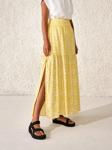 A modern HOZZ skirt is sure to become a new favourite. Easy to style and easy to wear. Colour: Yellow and white Maxi length skirt Hidden zip at waist Slit on both sides of skirt Tiered layers Material: 100% viscose Care: Machine wash at 30