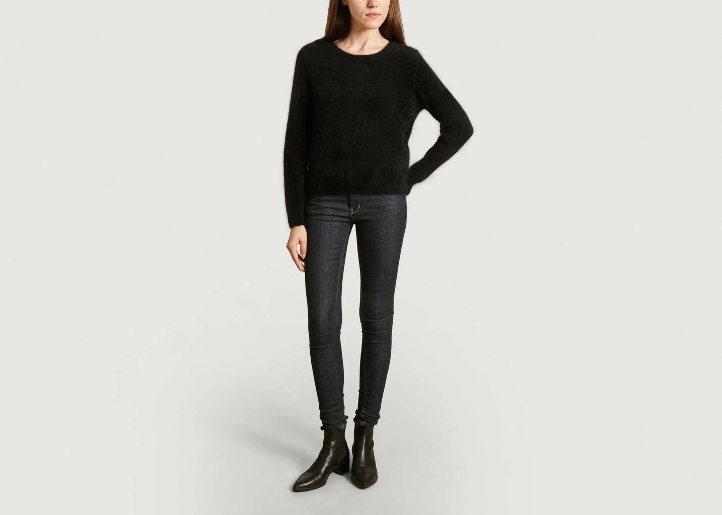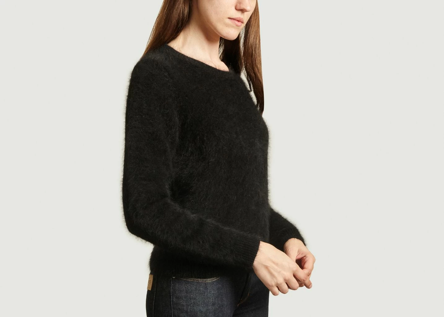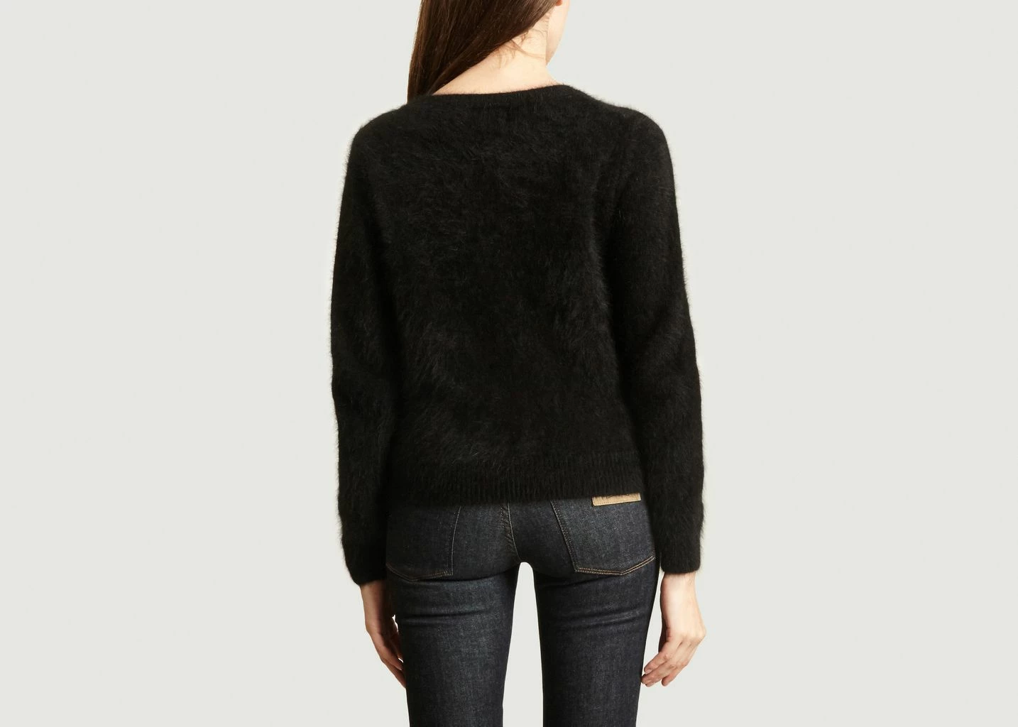Black angora and polyamide wire mesh sweater, fitted cut, long sleeves, round neck, ribbed finishes.