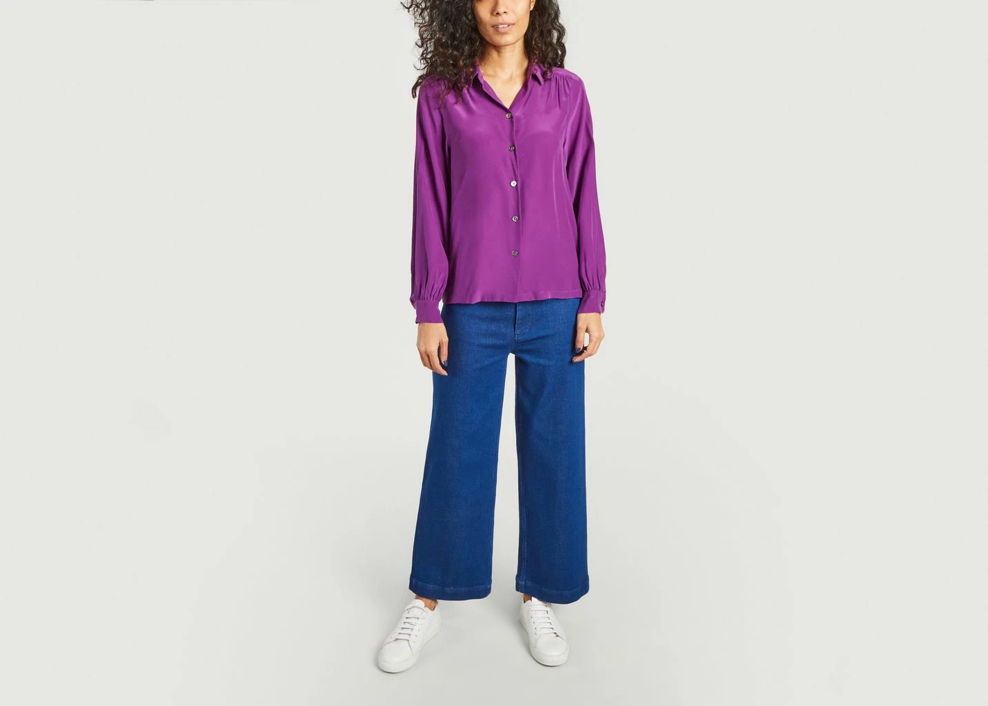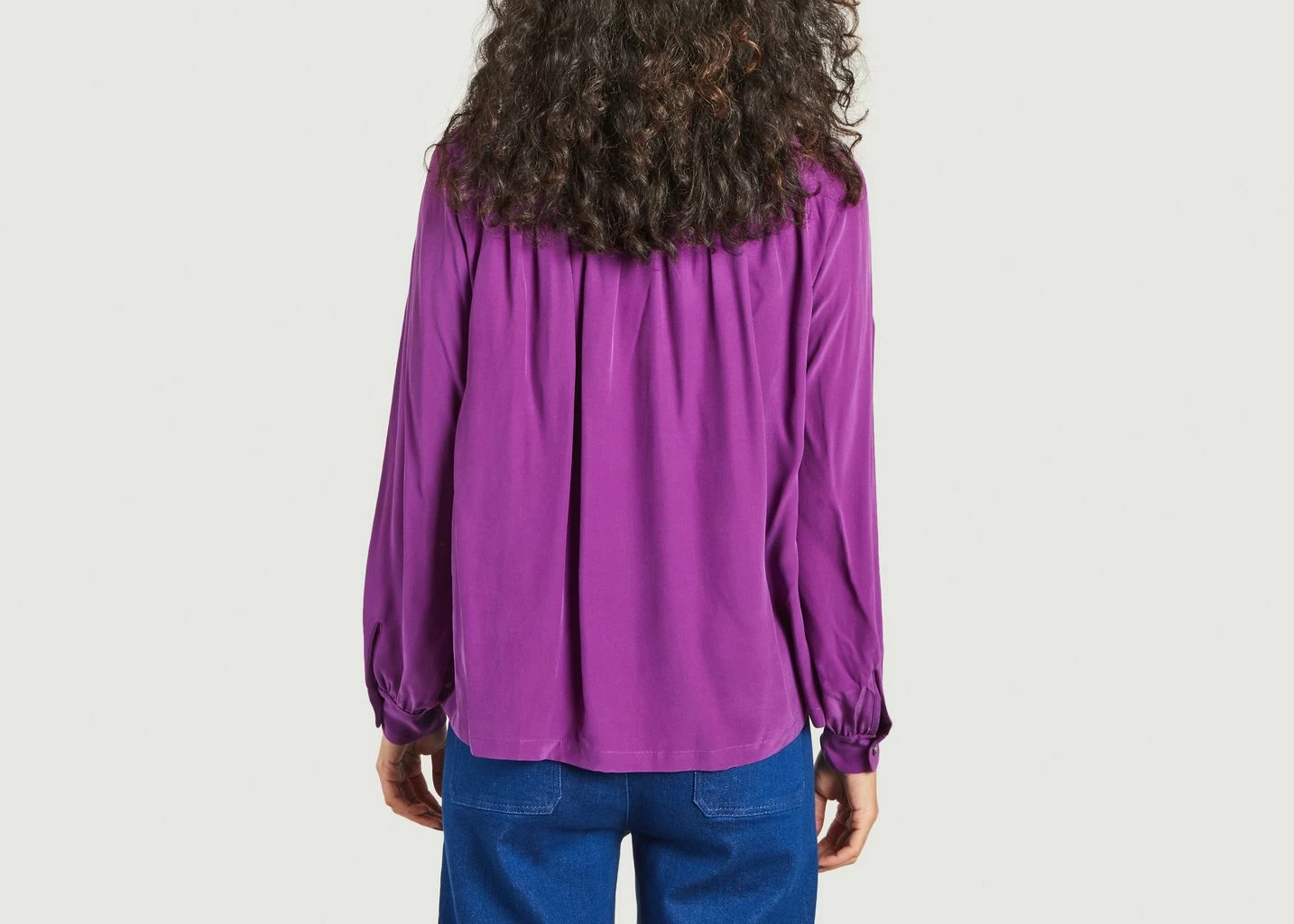 Plum colored silk shirt, straight fluid cut, long sleeves with buttoned cuffs, classic collar, central button placket, mother-of-pearl buttons, light pleats on the top. Go for the Taxi shirt by Bellerose, a good basic to have in your wardrobe ! We like its intense color which will bring some pep to your looks. This classic cut shirt will be worn with all your jeans and pants.