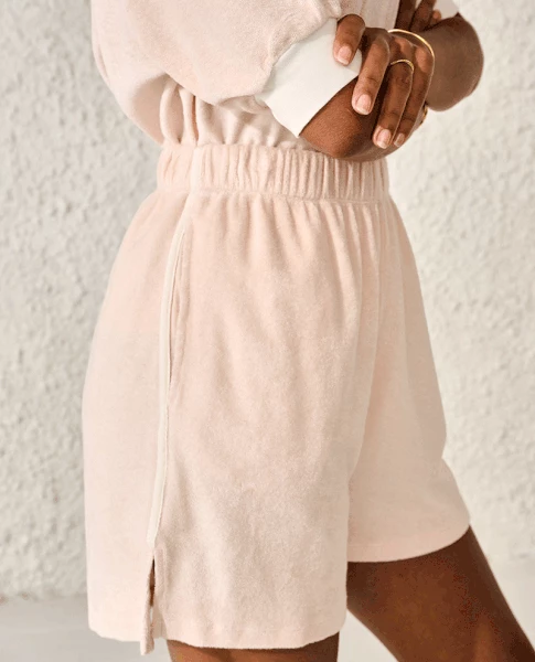 Bellerose Chania Ballerina Shorts, a pale pink pair of towelling shorts with a stretchy waistband and pockets. Also available in green and red these soft terry shorts can be worn with the matching sweatshirt. 66% Cotton & 34% Modal Machine wash at 30 with similar colours True to size, size down for a more fitted look