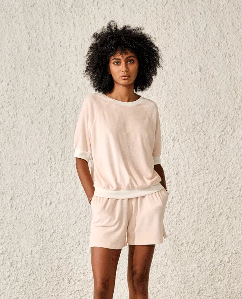 Bellerose Chilla Ballerina Sweatshirt, a pale pink towelling sweater with short puffed sleeves and a round neck. Finished with a cream ribbed trim the Chilla terry sweatshirt comes in green and red and can be paired with the matching shorts for a fun Summer look on holiday or at home. 66% Cotton & 34% Modal Machine wash at 30 with similar colours True to size, size down for a more fitted look