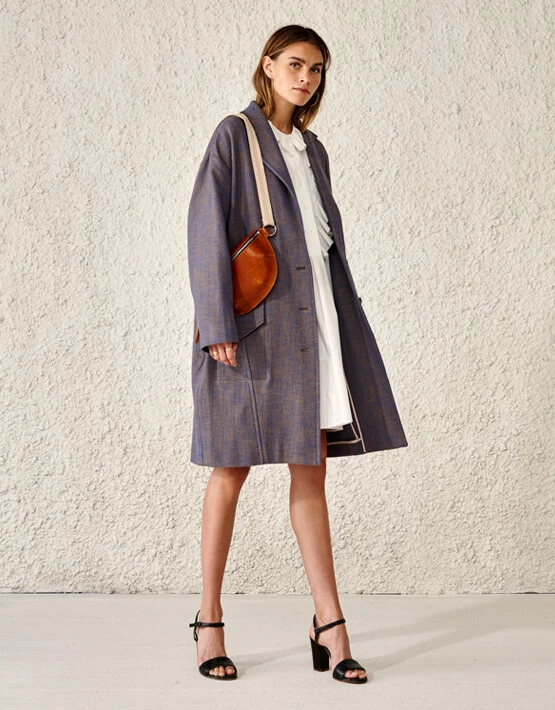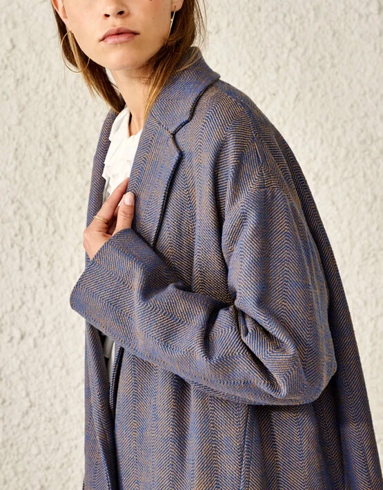 – Oversized coat – Unlined – Contrasting biais edges – Herringbone pattern – 88% Cotton, 10% Polyester, 2% Elastane – Sleeve lining: 1005 Acetate – BELLEROSE Sizing: XS – 0 S – 1 M – 2 L – 3 XL – 4 RD Size: M