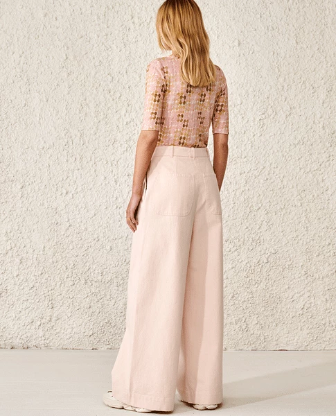 Bellerose Dallas Babe Trousers, a pale pink wide leg trousers with a high waist and pockets front and back. Complete with belt loops and a button and zip fastening these baby pink trousers have pleats on the front at the wait for extra volume. 80% Cotton & 20% Polyester Machine wash cold True to size