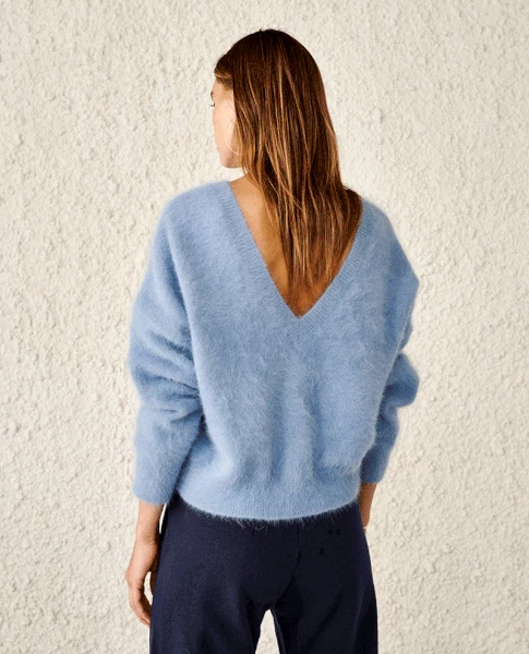 Bellerose Date Chambray Blue Knit, an update on the classic Datti jumper, this fluffy blue version has a deep v shaped back and a round neck. With more of a relaxed fit than the Datti the Date has long sleeves and a soft and fluffy texture. Super versatile, you could wear with the v-neck to the front. 65% Angora & 35% Polyamide Hand wash cold and dry flat Shedding will occur from the short angora fibres but this will settle after a few cold washes Fits true to size, size up for a more slouchy look