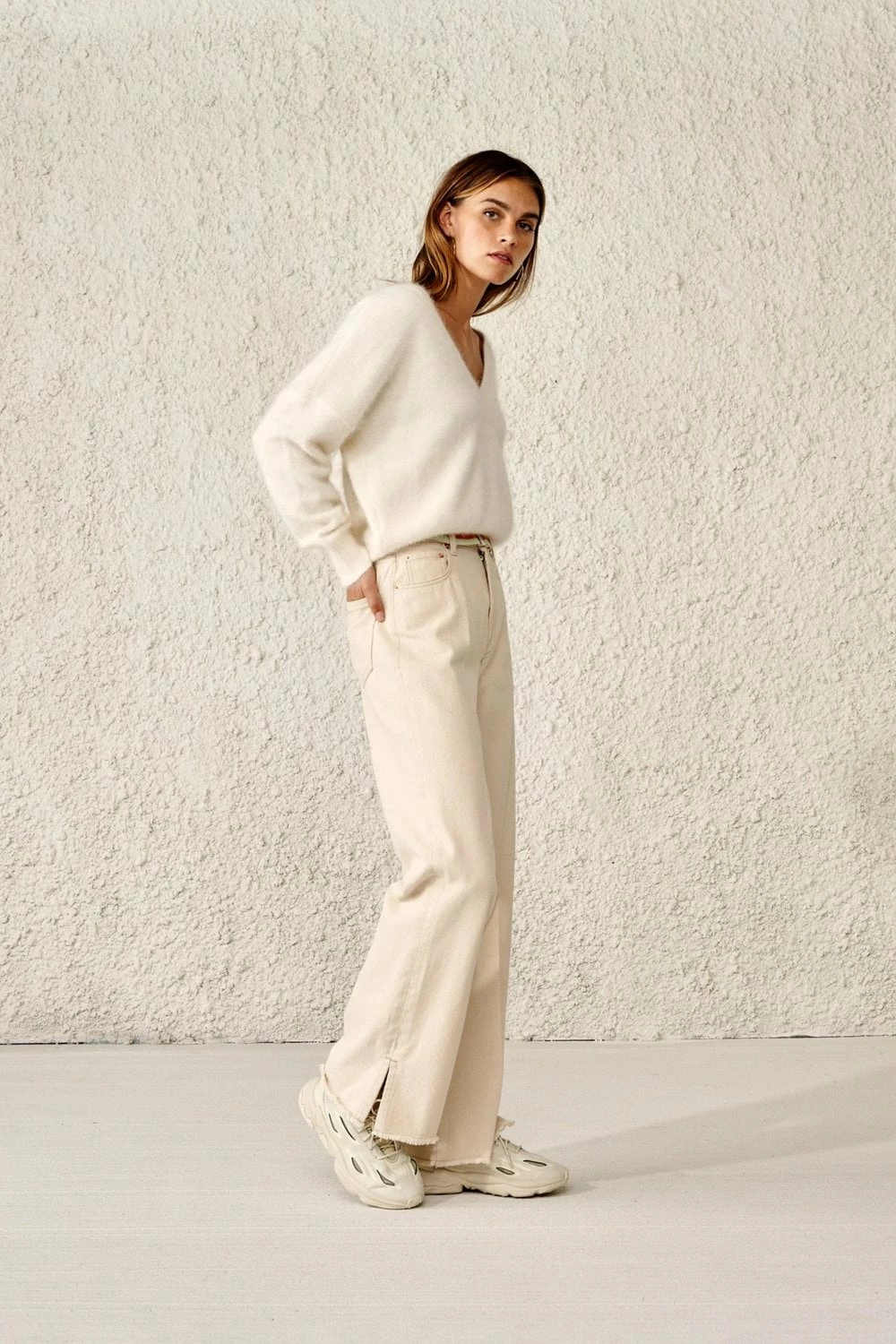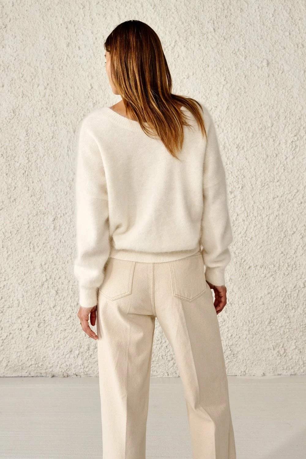 Datev Ecru V Back Neckline Ultra Soft Angora Blend Dropped Shoulder Ribbed Cuffs Fully Reversible V Neck 65% Angora 35% Polyamide Handwash in Cold Water 43052
