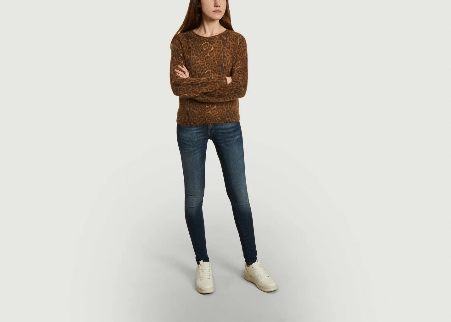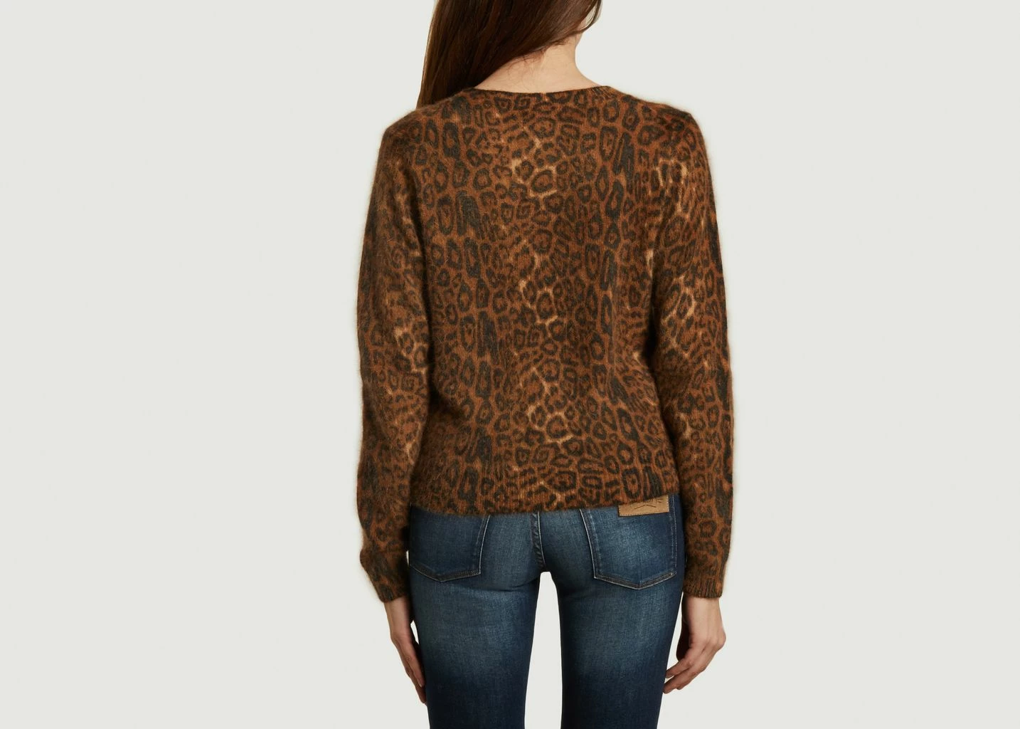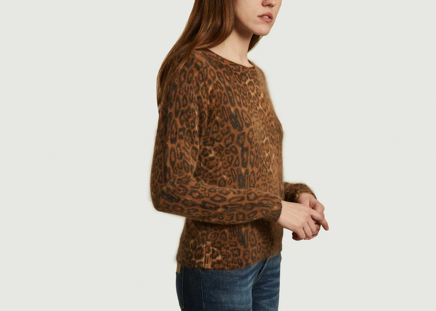 Sweater made of angora and polyamide with leopard print. Knitted in an angora blend that you want to curl up in all year round, it is both warm and light. It has a classic fit, round neck, long sleeves and ribbed trim. Note: Because the angora the brand uses was obtained by shearing rabbits, the hair is shorter and, as a result, angora products shed hair. This improves once the product has been washed (properly) but does not stop after washing. This is not a defect. It is part of the nature of angora yarns. Don’t hesitate to adopt this pretty Datti sweater by Bellerose. It can be worn with skinny jeans or over a classic shirt, but its featherweight knit also allows you to pair it with feminine skirts and dresses.