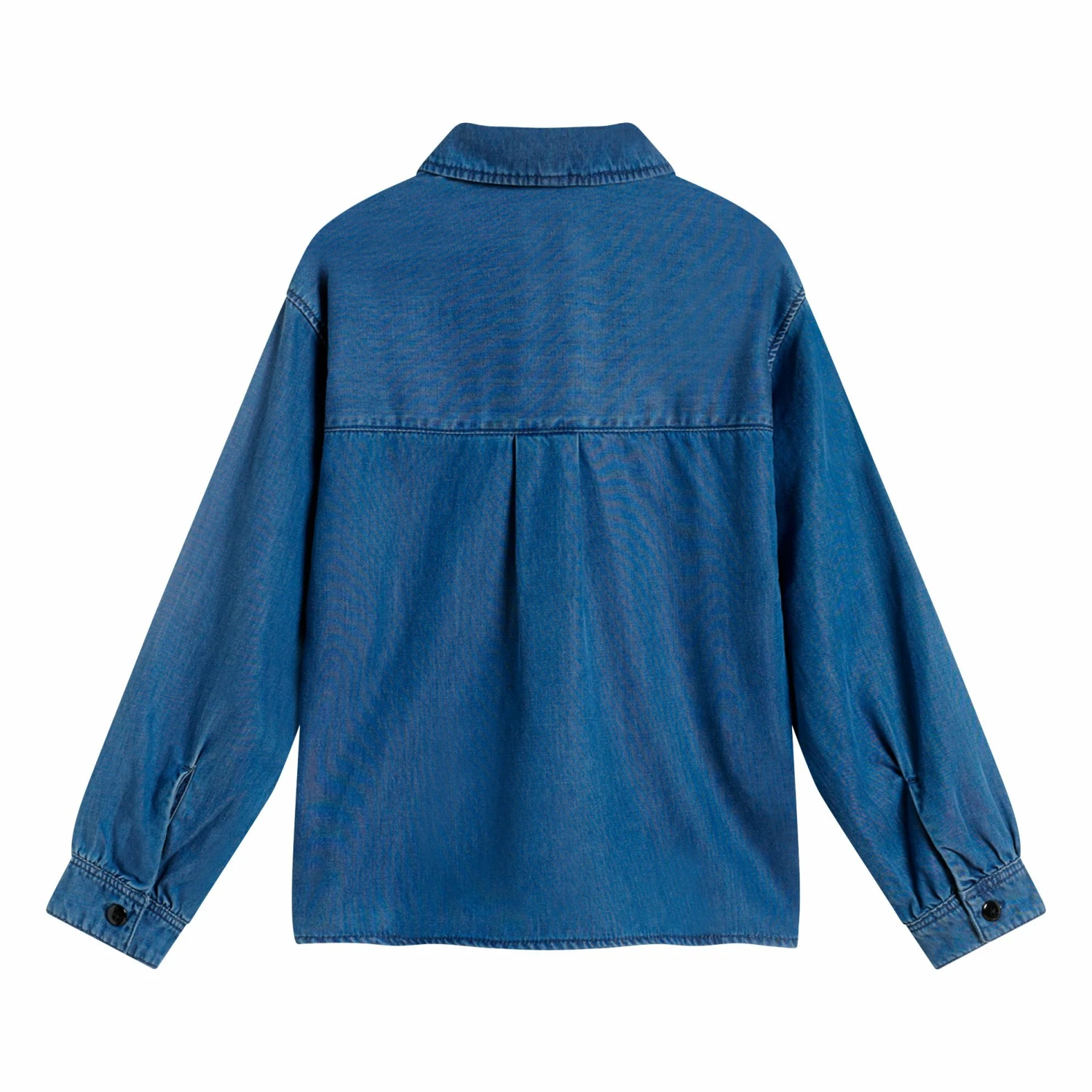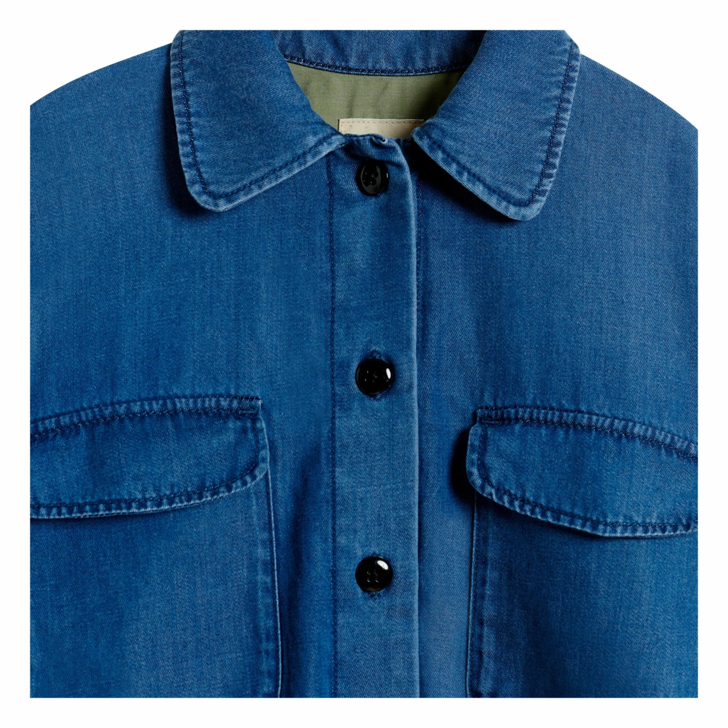 Fabrics: 55% lyocell, 45% cotton Details : Rounded Peter Pan collar, Rounded front panels, Slightly longer on the back,Two flap pockets on the chest Size of photographed item: 10 years Colour: Denim