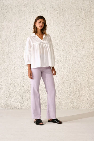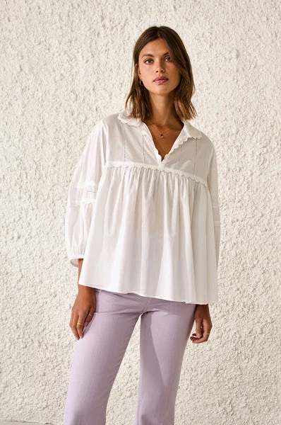 Summer dreams are made of light blouses and romantic details. Featuring vintage inspirations, lace trims, a classic collar, and puffed sleeves, it’ll look just right with a pair of shorts on a Sunday walk to the farmer’s market. We have this in Natural and Navy. – Lightweight cotton blouse – Open v-neckline with collar – Lace, pleated and gathered details – Lower hemline at the back – Puffed 3/4 length sleeves Size Conversion: 0/XXS, 1/XS, 2/S, 3/M, 4/L 0 1 2 3 4 Pit to Pit (cm) 56 60 61 65 66 Sleeve length (cm) 43 45 45 46 47 Total length (cm) 68 69 72 74 75 100% Cotton Machine wash at 30, do not tumble dry Made in India BW221403 R0747 110