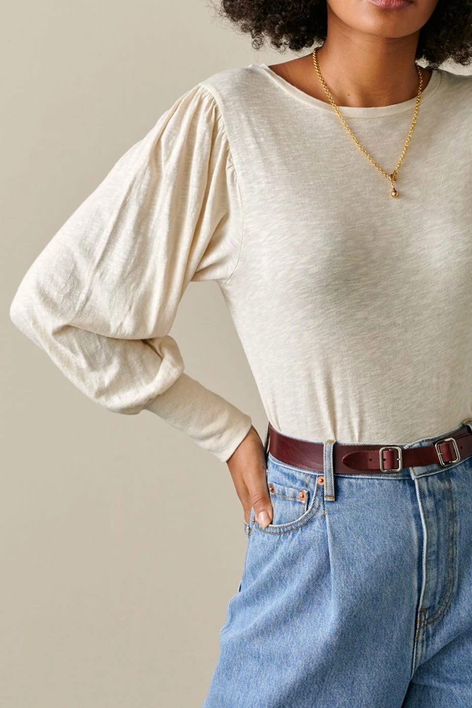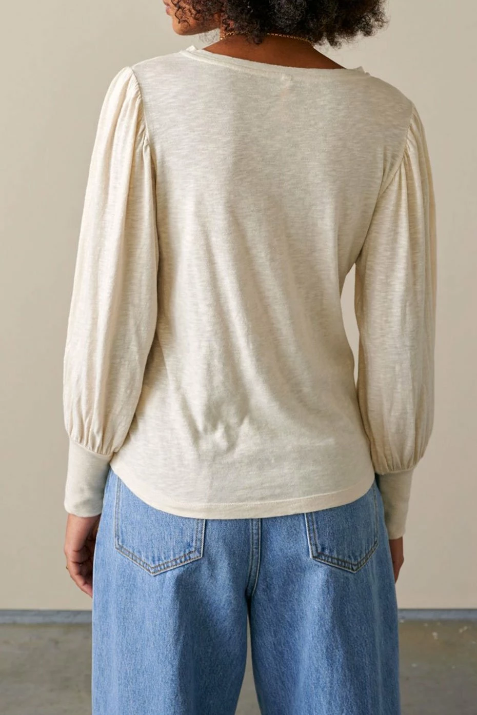 This Ecru Milie T-shirt is a wardrobe essential from Bellerose. Boasting puffed long sleeves and crafted in a soft cotton slub viscose blend and a scooped neckline, this tee is perfect for dressing up or down.