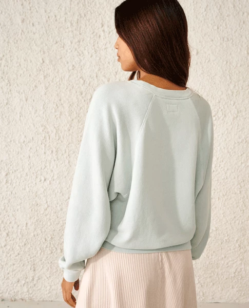 Bellerose Fella Surf Sweatshirt, a light blue long sleeved sweater with a round neck and a relaxed fit. Also available in tangerine this oversized jersey sweat has raglan sleeves and ribbed cuffs and hem. 75% Cotton & 25% Polyester Machine wash at 30 Size down if you prefer a more fitted look