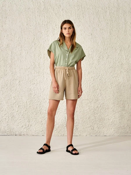 When ultimate comfort jet style blend in the perfect pair of shorts, we know we’re onto something! Workout or chill out – your call! is up to anything. Crafted in light cool cotton fleece with an elasticated waist—and matching draw-string— a secured raw edge, top-notch faded colors, and a handy patched pocket in the back. Guess what, we also have the matching Fellow Sweatshirt from Bellerose. Comfort zone, here we come! Sizing:0 (XS)1 (S)2 (M)3 (L)4 (XL) 75% Cotton – 25% Polyester Made in Portugal Machine wash at 30°C or lower Do not bleach Do not tumble dry Iron at low temperature/heat 110°C Do not dry clean