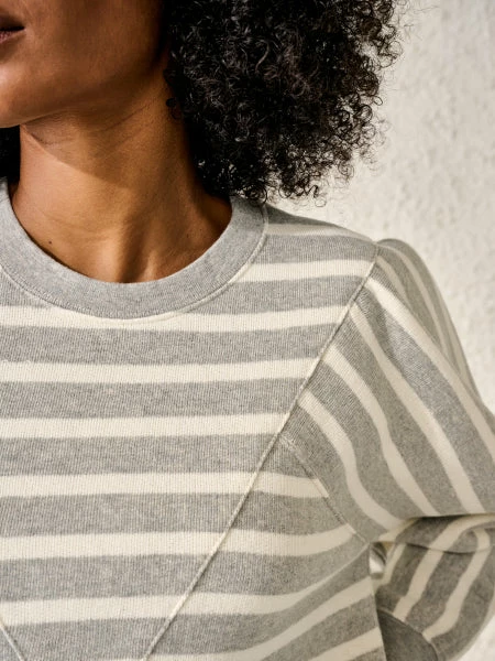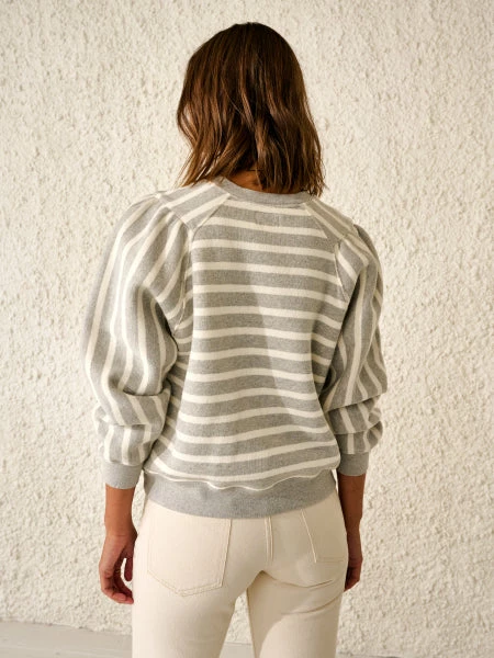 Bellerose delivers yet another classic sweatshirt with a twist and boy, do we love it! It comes in grey with cream horizontal stripes with long puffed sleeves. It sticks to a high rounded neckline but with its V-shaped seam on the front, it keeps it interesting. We also have this style in cream with blue stripes; the Frida Sweatshirt – Cream/Blue. Sizing: 0 (XS)1 (S)2 (M)3 (L) 75% Cotton – 25% Polyester Made in Portugal Machine wash at 30°C or lower Do not bleach Do not tumble dry Iron at low temperature/ heat 110°C Do not dry clean