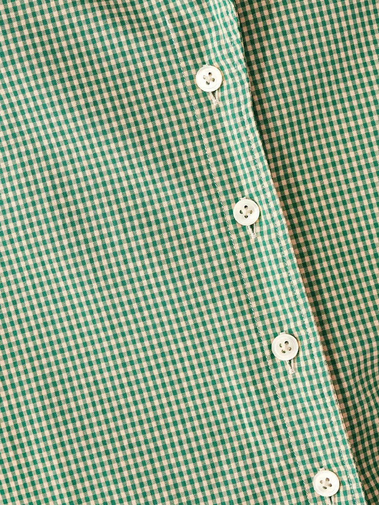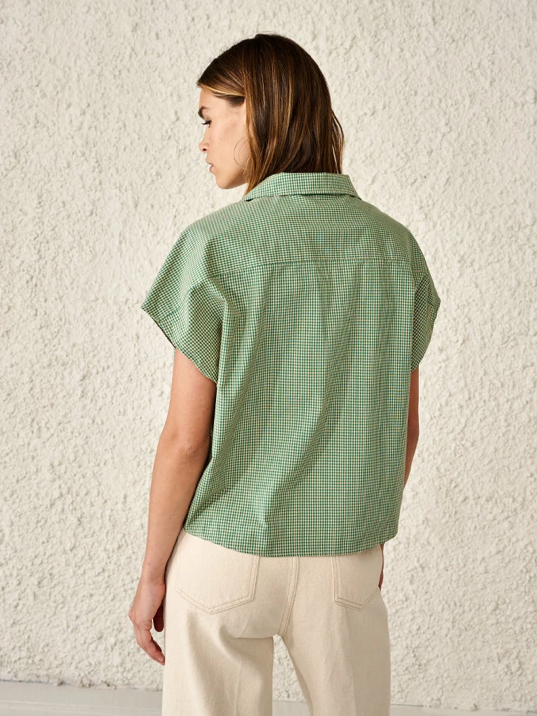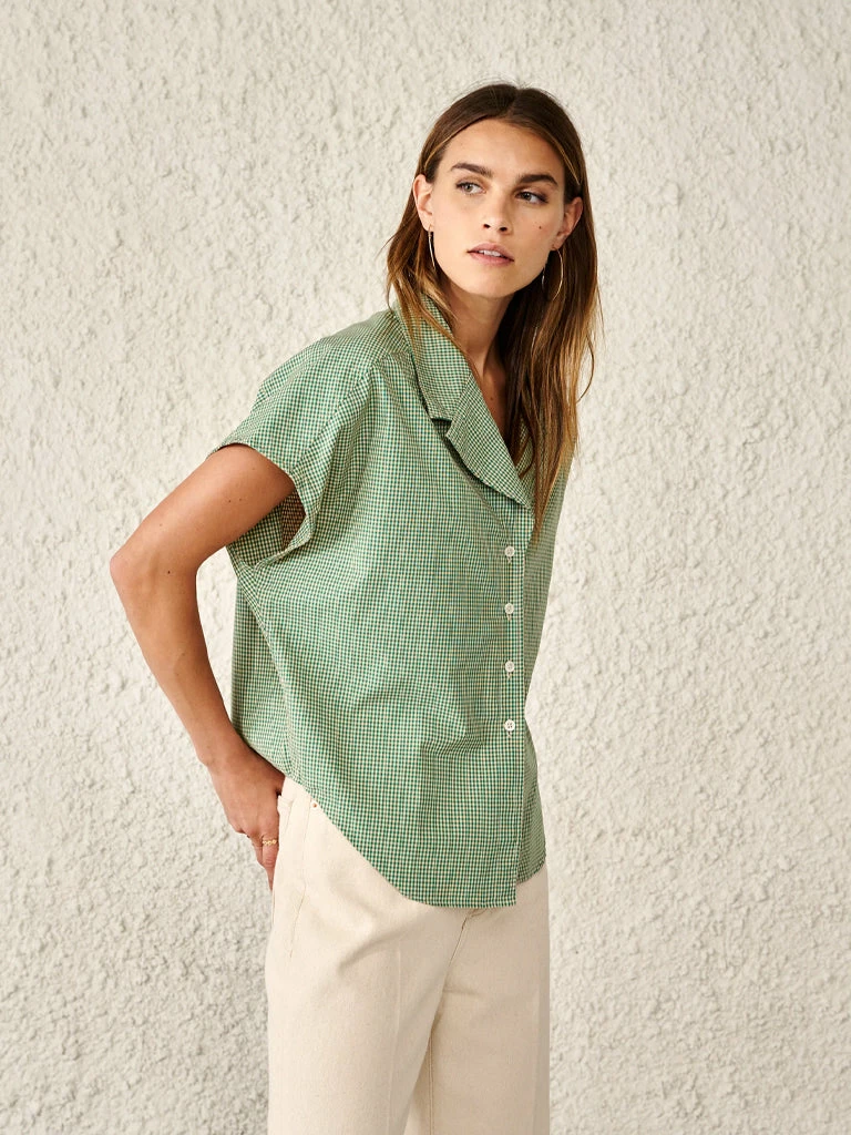 Crafted from pure cotton with a fresh gingham print, the Gerda Shirt from Bellerose features a notched collar, sharp shoulders, and an optional self-tie knot in the front. Finished with a curved front hem and mother of pearl buttons. 100% cotton ’80s style sleeveless shirt Notched collar Mother of pearl buttons Curved front hem to can be worn knotted or not Machine wash cold