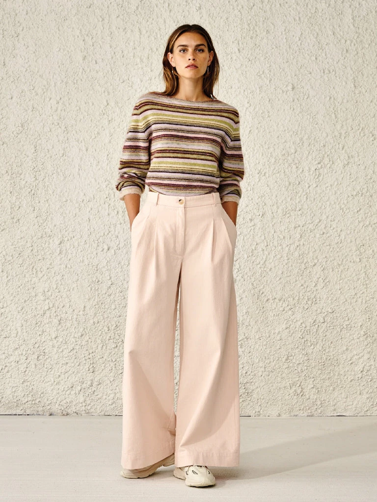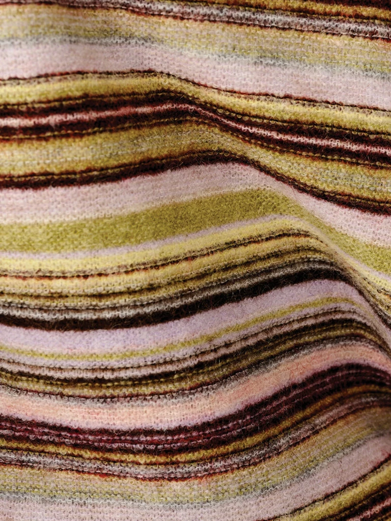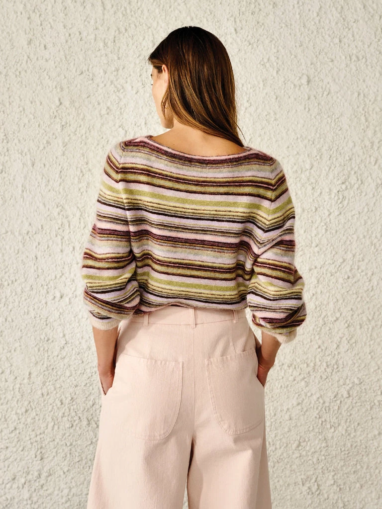 Crafted from a blend of merino wool and mohair, the Gersi Knit from Bellerose is a year-round wardrobe essential. The knit offers a relaxed classic cut, boat neckline, wide raglan sleeves, and ribbed edges. 38% wool merino, 30% mohair, 29% polyamide/nylon, 3% elastane Multi-coloured striped boat neck sweater Wool and mohair blend Relaxed classic cut Boat neck Wide raglan sleeves Model is 5’7″ tall and wears a size 8