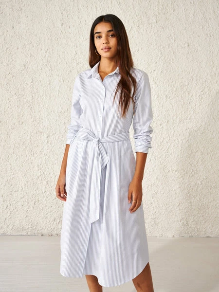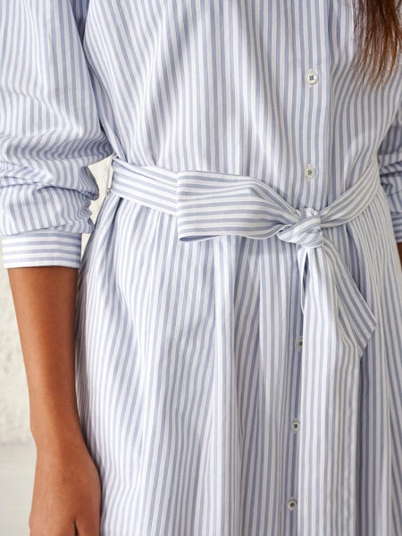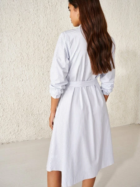 The shirt dress strikes again. This one was designed to fit taller or shorter frames alike. Crafted from cotton poplin with a button front, classic collar, patched pocket, and rounded hemline, it stands out thanks to its understated simplicity and elegance. Wear it with or without the matching belt depending on how much volume you’re seeking out and finish the look with your favorite sneakers for a more casual take. Comes in a blue and white stripe. Sizing:0 (XS)1 (S)2 (M)3 (L) 4 (XL) 100% Cotton Made in Thailand Machine wash at 30°C or lower, low bleach allowed, do not fill the drum, delicate spin. Do not bleach Tumble dry at 50°C or lower Iron at low temperature/heat 110°C Do not dry clean