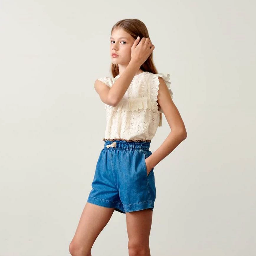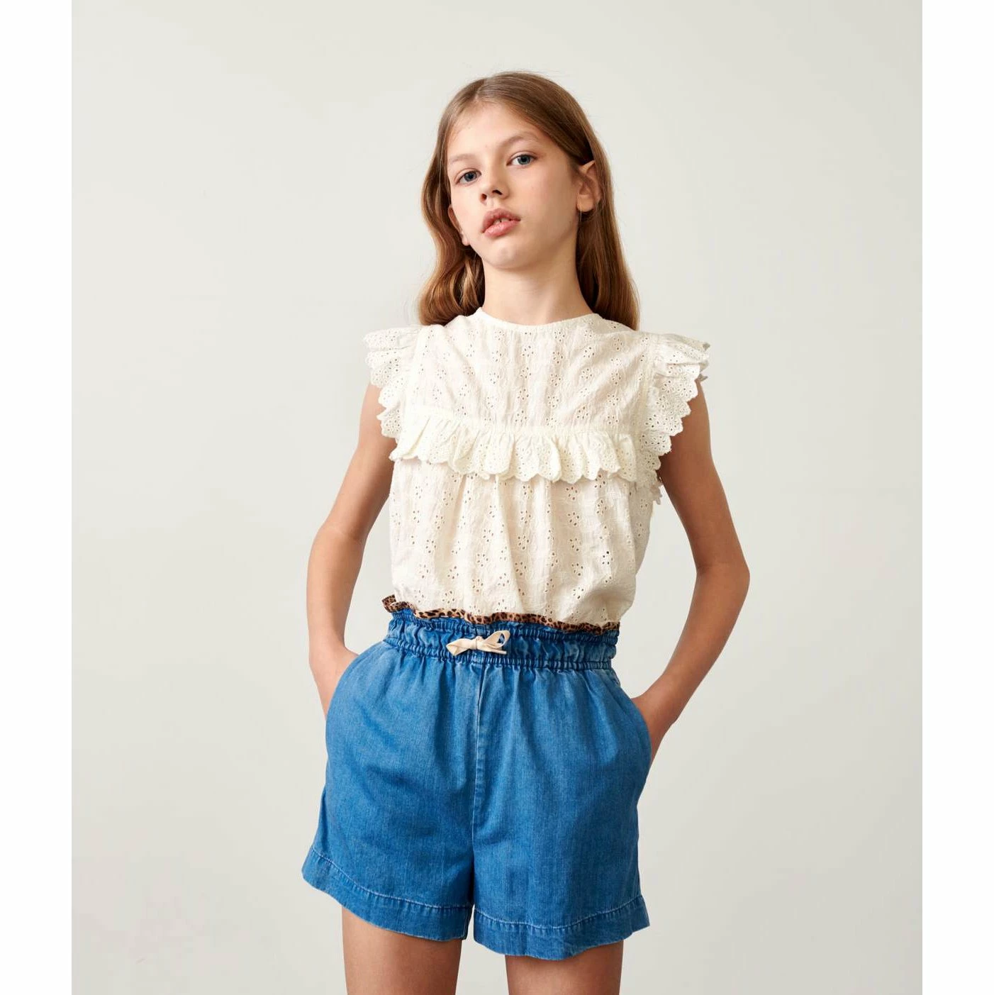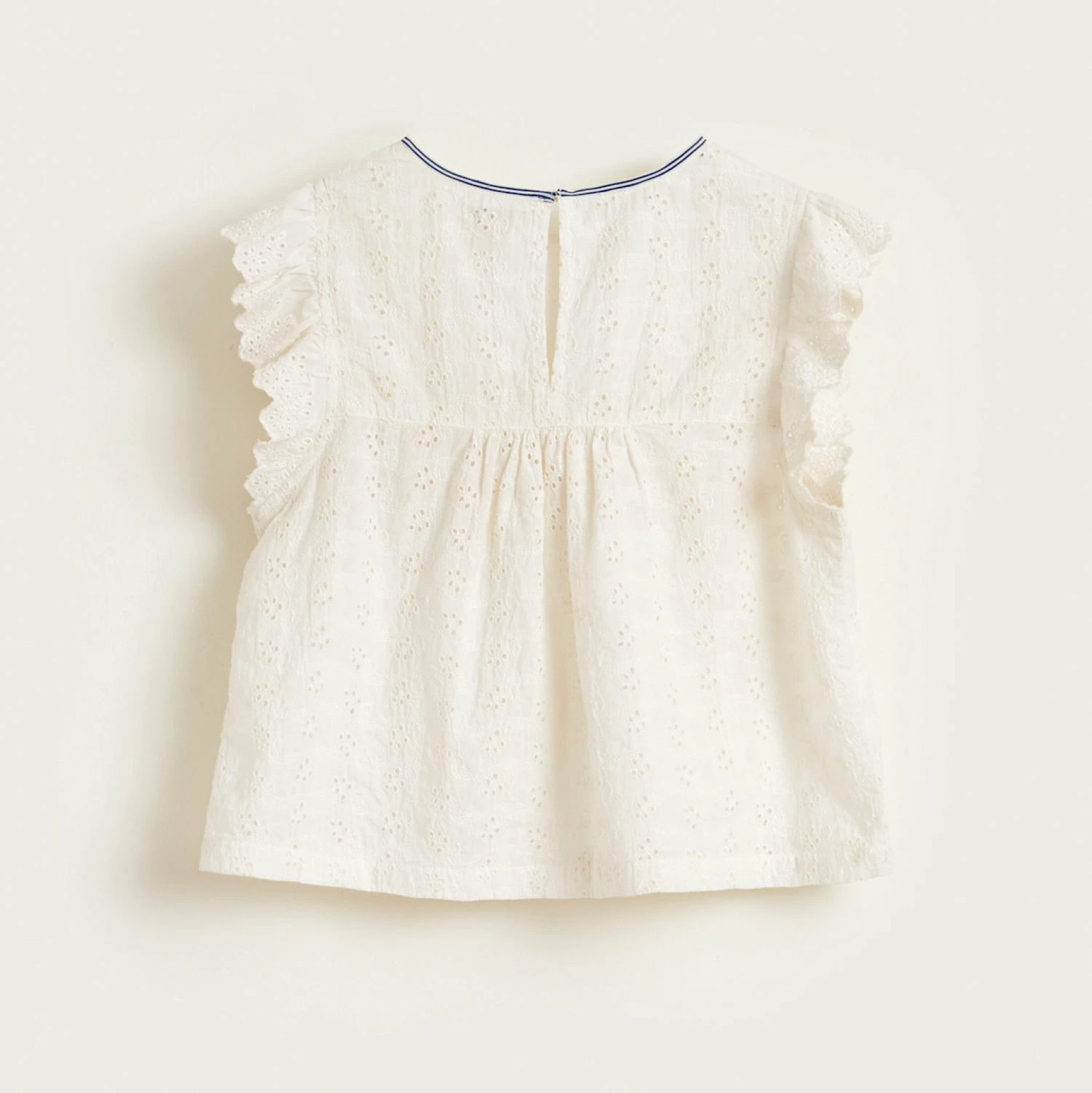 A romantic top inspired by early 20th century designs. That’s our HANNA top in a nutshell. Made in a delicately embroidered cotton, it’s full of refined details like the ruffled cap sleeves and pleats in the front and back. Drop opening at the back, a single ruffle in the front and a loose fit for both comfort and style. She’ll love to wear it for special occasions but it can also be dressed down if worn with a pair of denim shorts and sandals. Details: Romantic top, Vintage inspired, Ruffled cap sleeves, Eyelets and embroidery all over Composition: 100% cotton Colour: Off-White