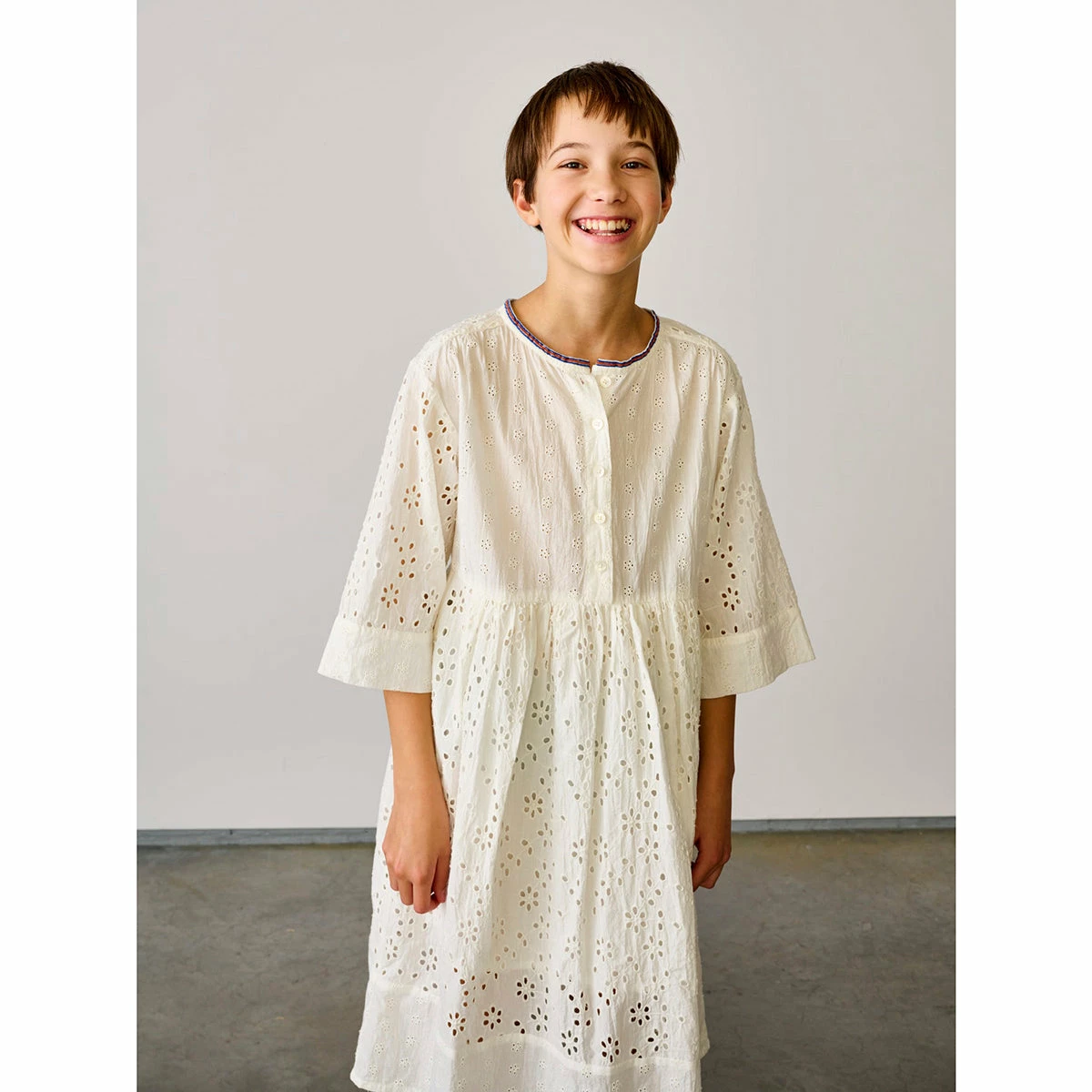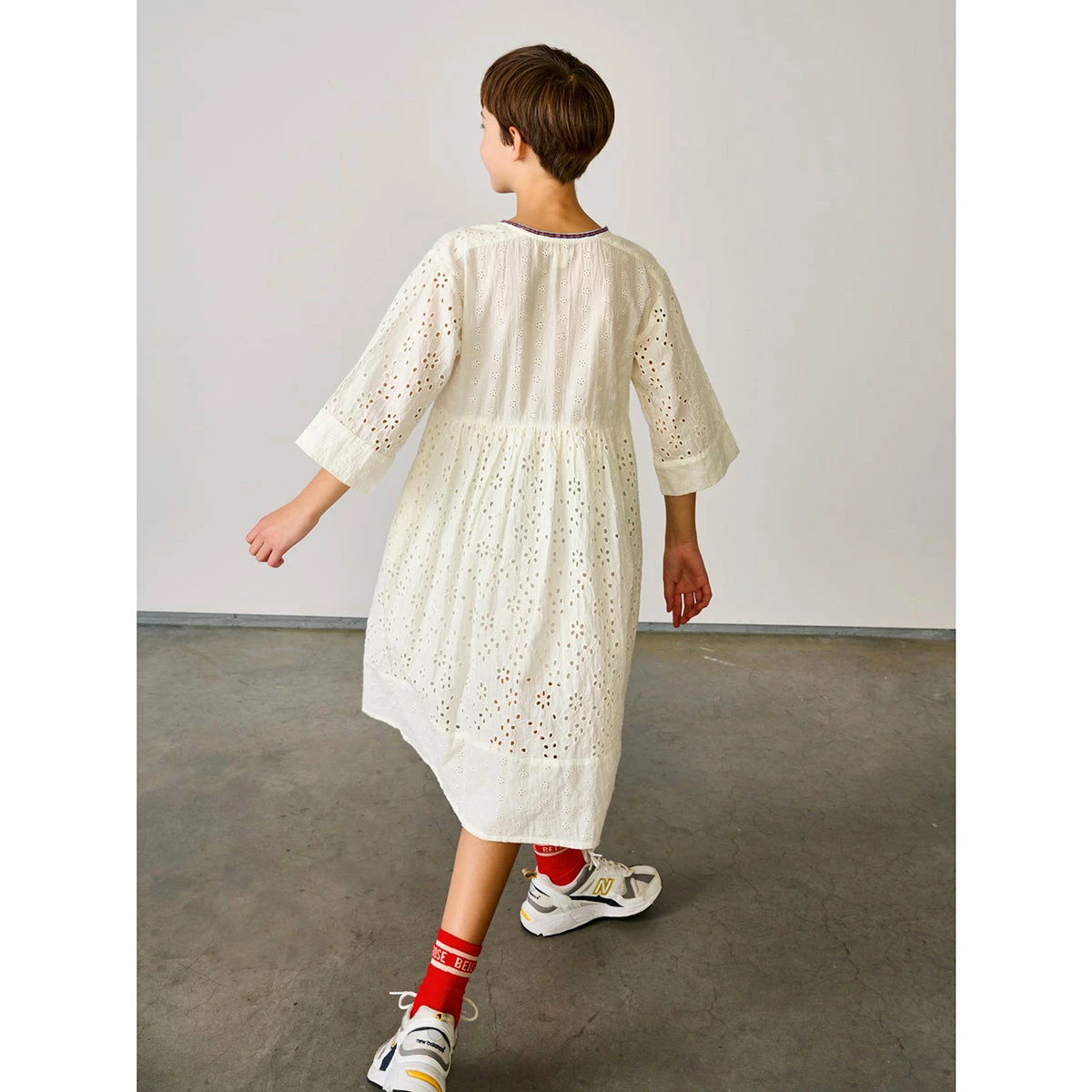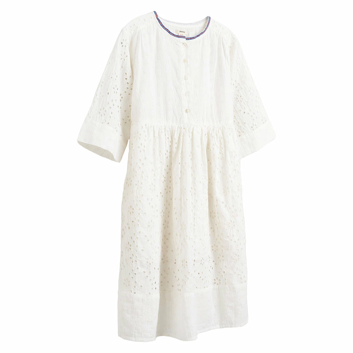 This schiffli cotton fabric combined with the refined details of the Hoboes dress from Bellerose makes for an eye-catching combination. Designed with balmy days in mind, it is crafted from pure cotton in different lace patterns. It presents a roomy midi cut, buttoned front, elbow-length sleeves, and contrasting piping along the neckline. A romantic yet modern dress that she can take from simple to dressier looks in the blink of an eye. Details: Schiffli midi dress | Roomy fit | Button front Composition: 100% cotton Colour: Off white Care details: Machine wash at 30°C or lower, do not fill the drum | Do not bleach | Do not tumble dry | Iron at medium temperature / Heat 150°C | Do not dry clean