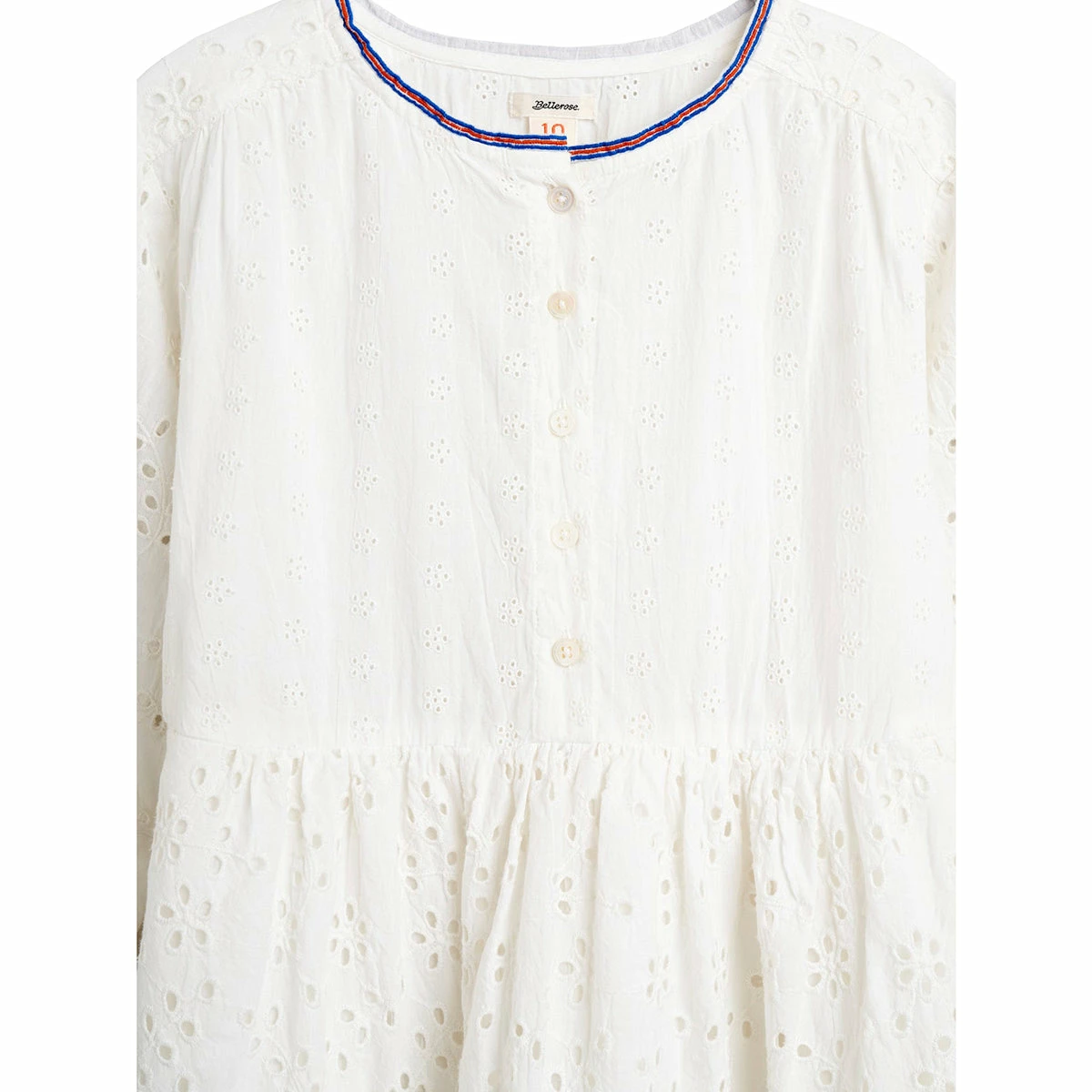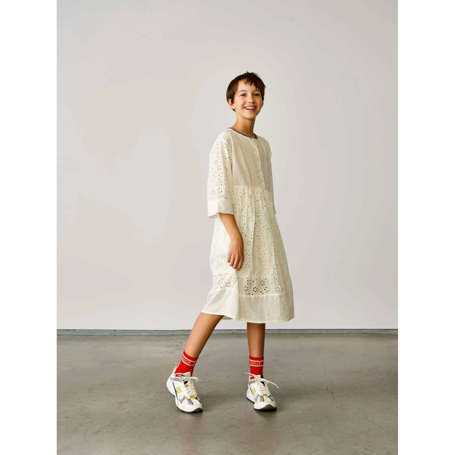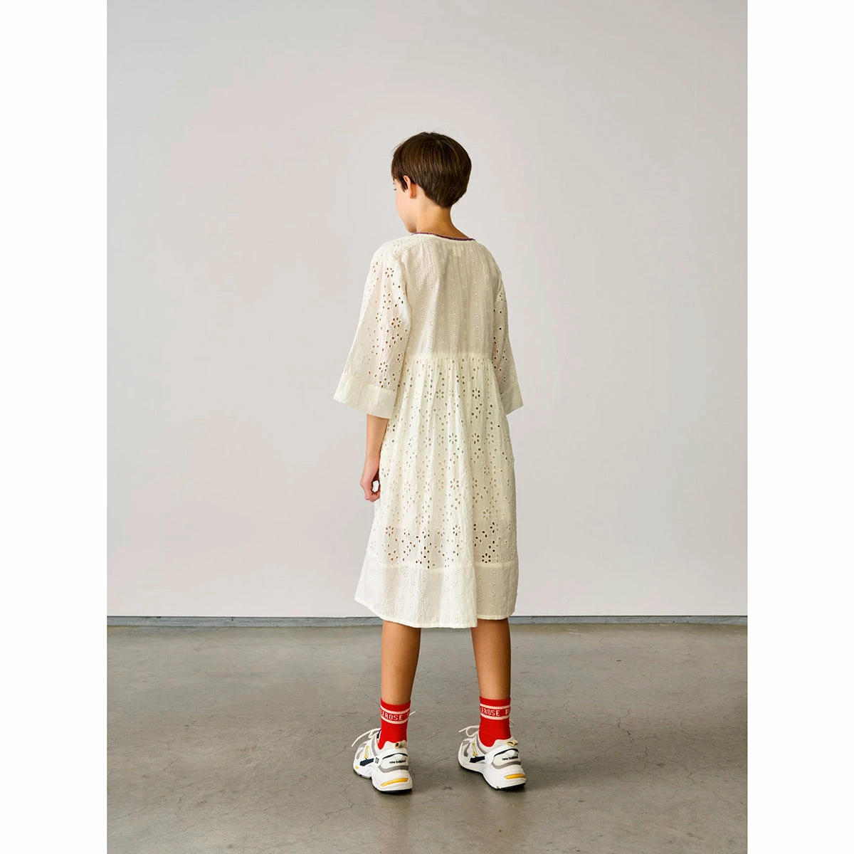 This schiffli cotton fabric combined with the refined details of the Hoboes dress from Bellerose makes for an eye-catching combination. Designed with balmy days in mind, it is crafted from pure cotton in different lace patterns. It presents a roomy midi cut, buttoned front, elbow-length sleeves, and contrasting piping along the neckline. A romantic yet modern dress that she can take from simple to dressier looks in the blink of an eye. Details: Schiffli midi dress | Roomy fit | Button front Composition: 100% cotton Colour: Off white Care details: Machine wash at 30°C or lower, do not fill the drum | Do not bleach | Do not tumble dry | Iron at medium temperature / Heat 150°C | Do not dry clean