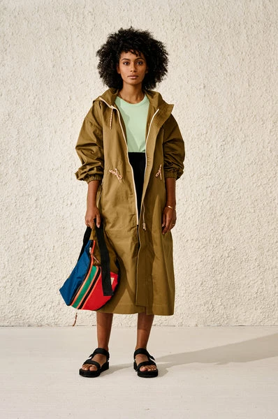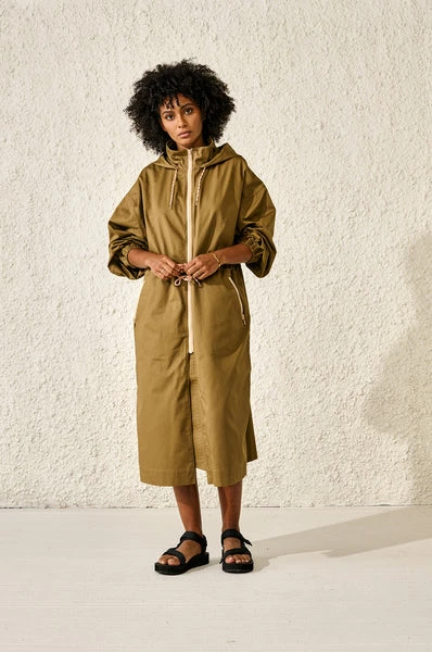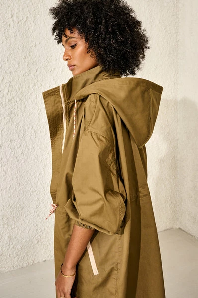 Adding to its roster of covetable outerwear, Bellerose give us the Hosfo Coat. Swapping plush fabric for a transitional shell alternative that boasts wind and water-resistant properties, it features a longline silhouette with a practical hood and high funnel collar, protecting you from any unexpected climes ahead. Shaped into a relaxed style, it’s ready to take you from your morning commute to weekend walks and everywhere in between. – Military green – Straight cut – Oversized fit – Cropped sleeves with elasticated cuffs – 2 zipped pockets – Chunky zip closure in contrasting cream – Drawstring hood and waist for adjustability We recommend sizing down as this style comes up large. Size Conversion: XXS/0, XS/1, S/2, M/3, L/4
