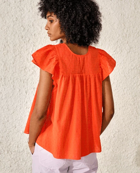 Bellerose Hourra Teaser Blouse we LOVE this tomato red cotton blouse with short ruffled sleeves and a v neck. Lightweight and floaty the Hourra top has a subtle tonal stripe and a raised textured dot all over. 100% Cotton Machine wash at 30 True to size