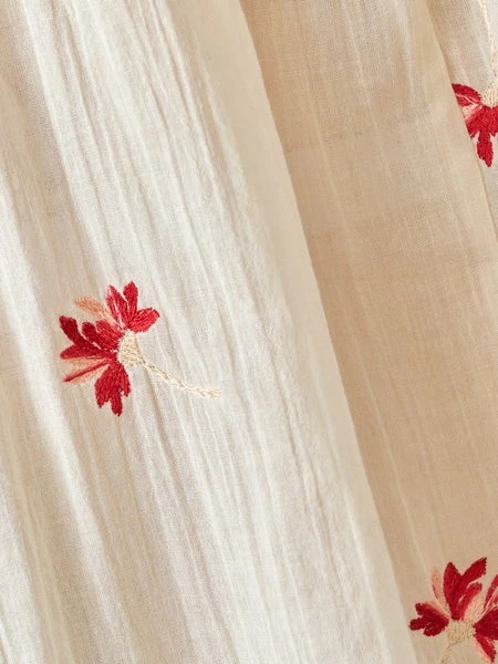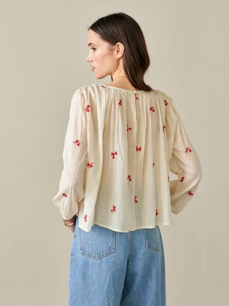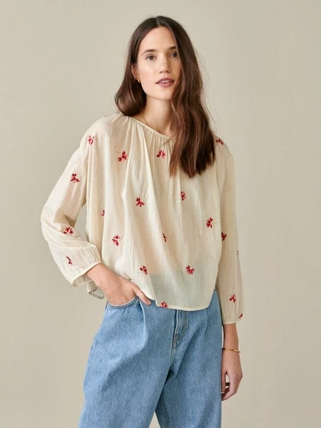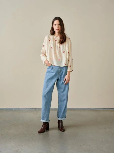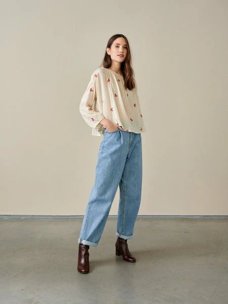 A romantic peasant-style blouse reworked for the modern world, our IROKO is made of light 100% cotton. Voluminous and loose through the bust, it features a gathered neckline and cuffs, puff sleeves, and all-over in-house embroidery details giving it an authentic vintage look. Closed by a single button in the back, it’ll work wonders with a pair of slim-fit pants or any high-rise garment. 100% cotton Made in India Enkel koude handwas, Do not bleach, Do not tumble dry, Iron at low temperature / Heat 110?C, Dry clean
