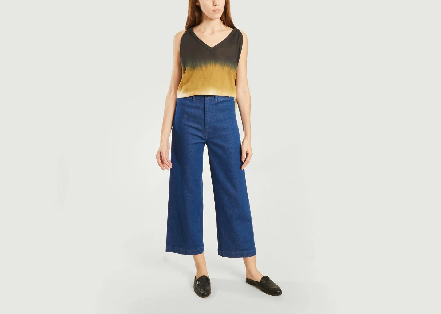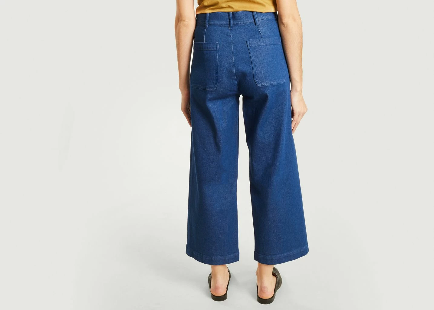 Blue jeans pants made of cotton. Straight cut, high waist, has 2 front and 2 back pockets. Button closure with concealed fly and belt loops. Bellerose offers us here the Jeans Pants with its straight high cut. You can wear it with a top close to the body and a pair of sneakers for a casual look.