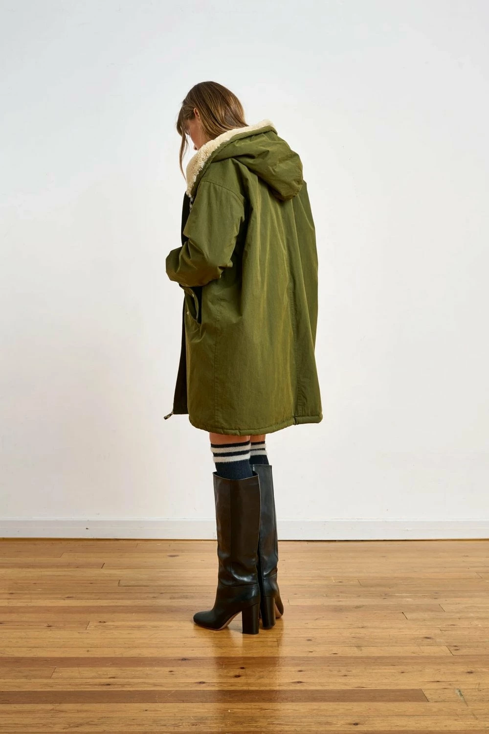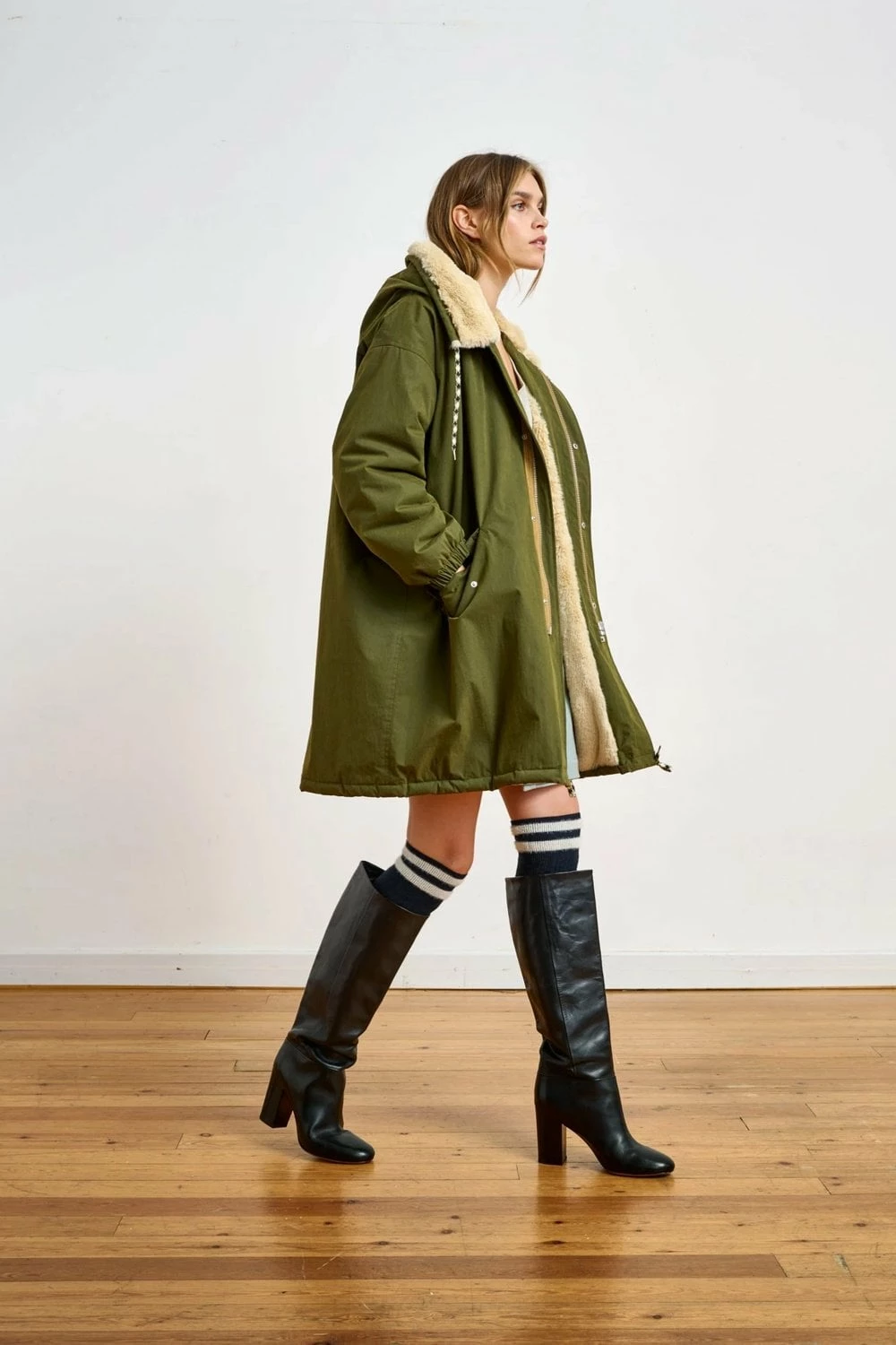 Parka Olive Oversized Roomy fit Hood Faux fur lining Trademark contrast drawstring 64% polyester, 36% cotton, Lining:100% polyester, 42849