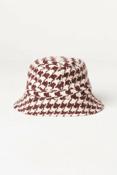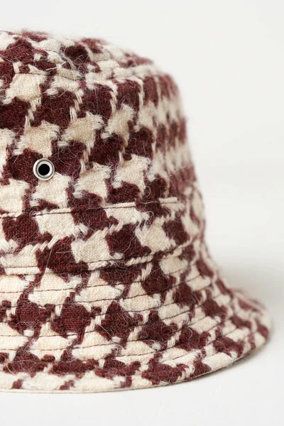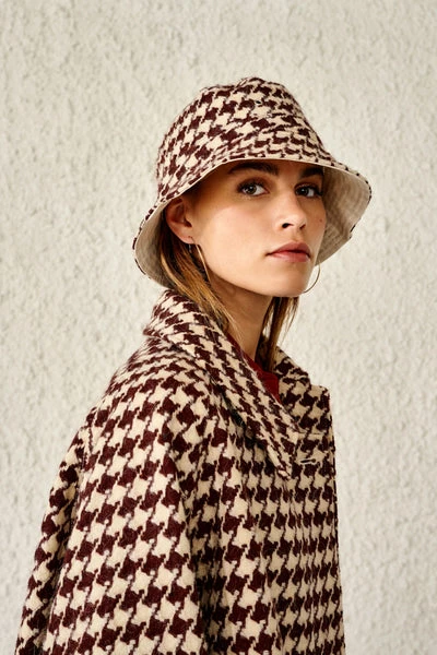 Let us revive a ’90s icon with a modern twist. The LARYA bucket hat is the perfect addition to a laid-back look. Fashionable, comfy, and cool… and don’t get us started on this giant houndstooth pattern. We’re such fans! Bucket hat Acrylic and vinrgin wool blend Houndstooth pattern 33% acrylic 19% virgin wool 18% polyester 18% wool 8% alpaga 4% other fibres Lining : 100% cotton Made in Europe Do not wash Do not bleach Do not tumble dry Iron at low temperature / Heat 110°C Dry clean with extra care