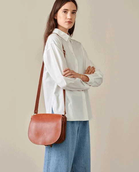 Bellerose Lorina Cognac Bag, a brown leather cross body bag with an adjustable long strap and silver metal buckels. 100% Leather Leather care recommended 24 x 20 x 13cm