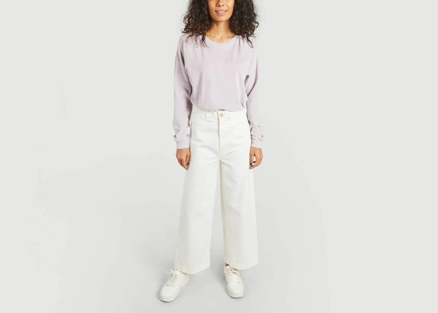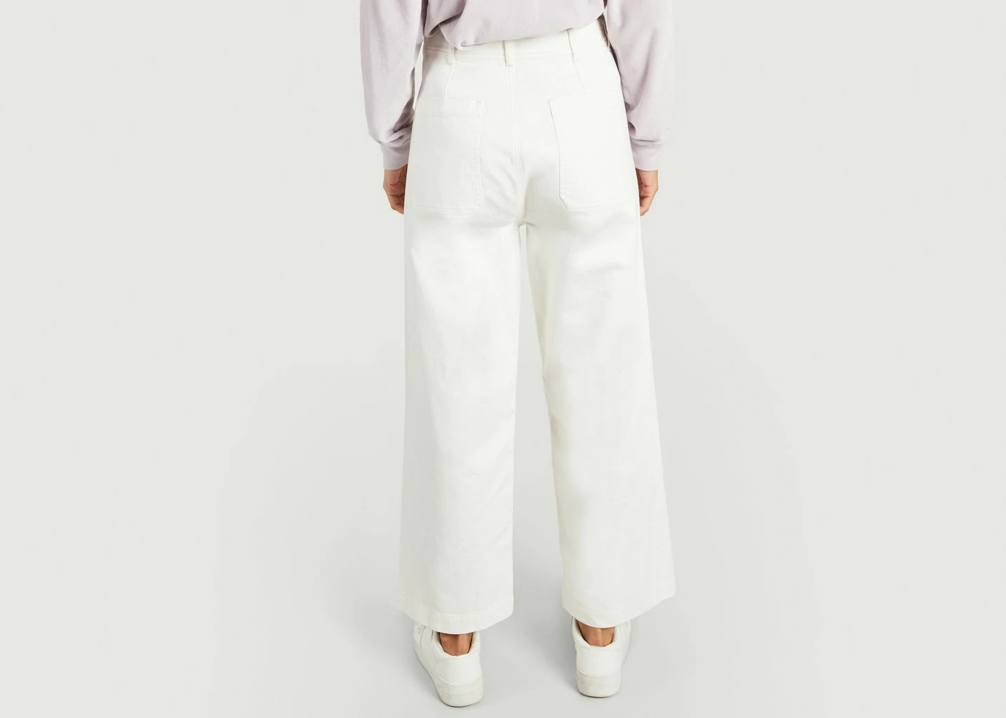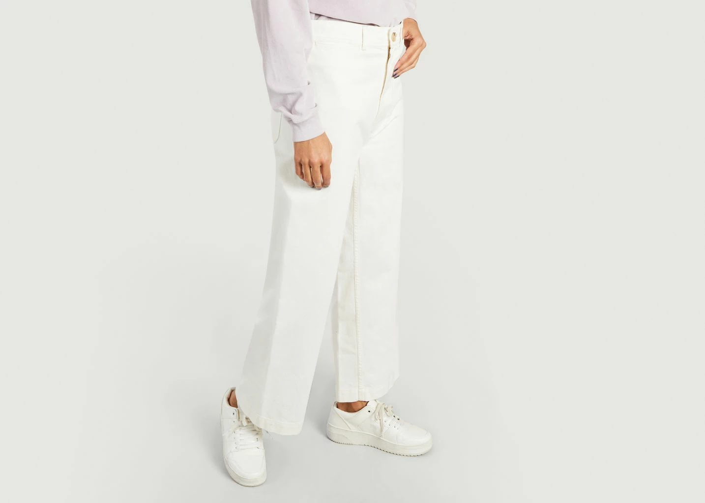 Cream cotton pants, half lined, high waist, wide leg, ankle length, concealed zipper closure topped with a button, belt loops, 2 discreet front pockets and 2 patch pockets in back. This model in the sober color will be easy to wear and to match in everyday life. You will be able to associate it with a sweater and sneakers in mid-season then with a sleeveless top and sandals in summer.