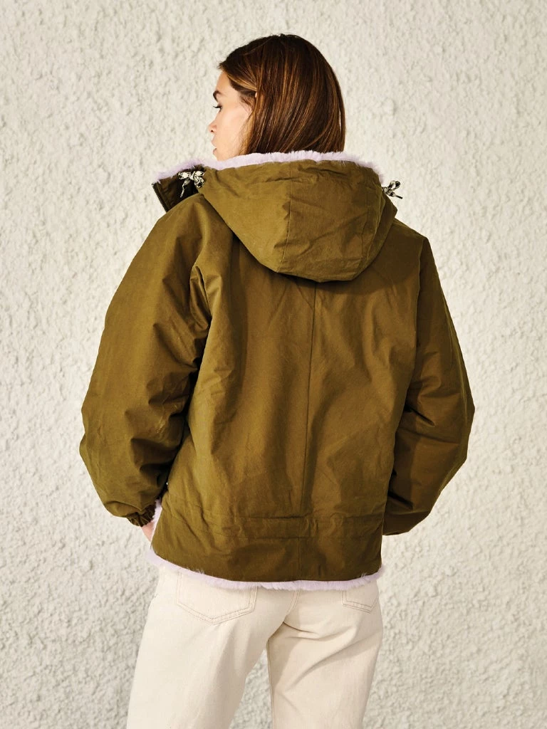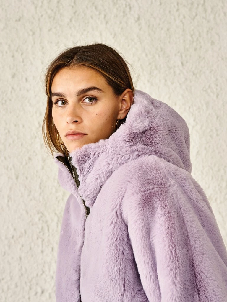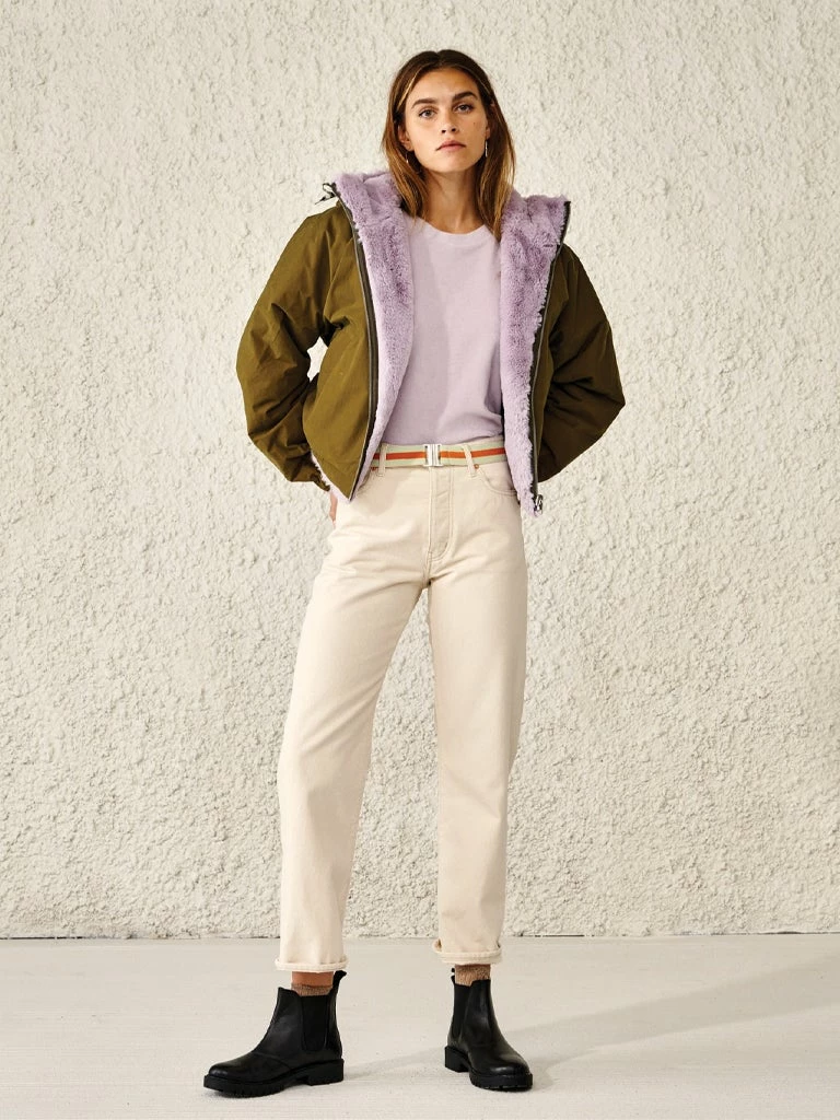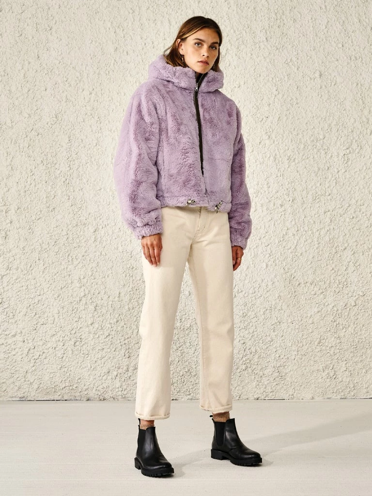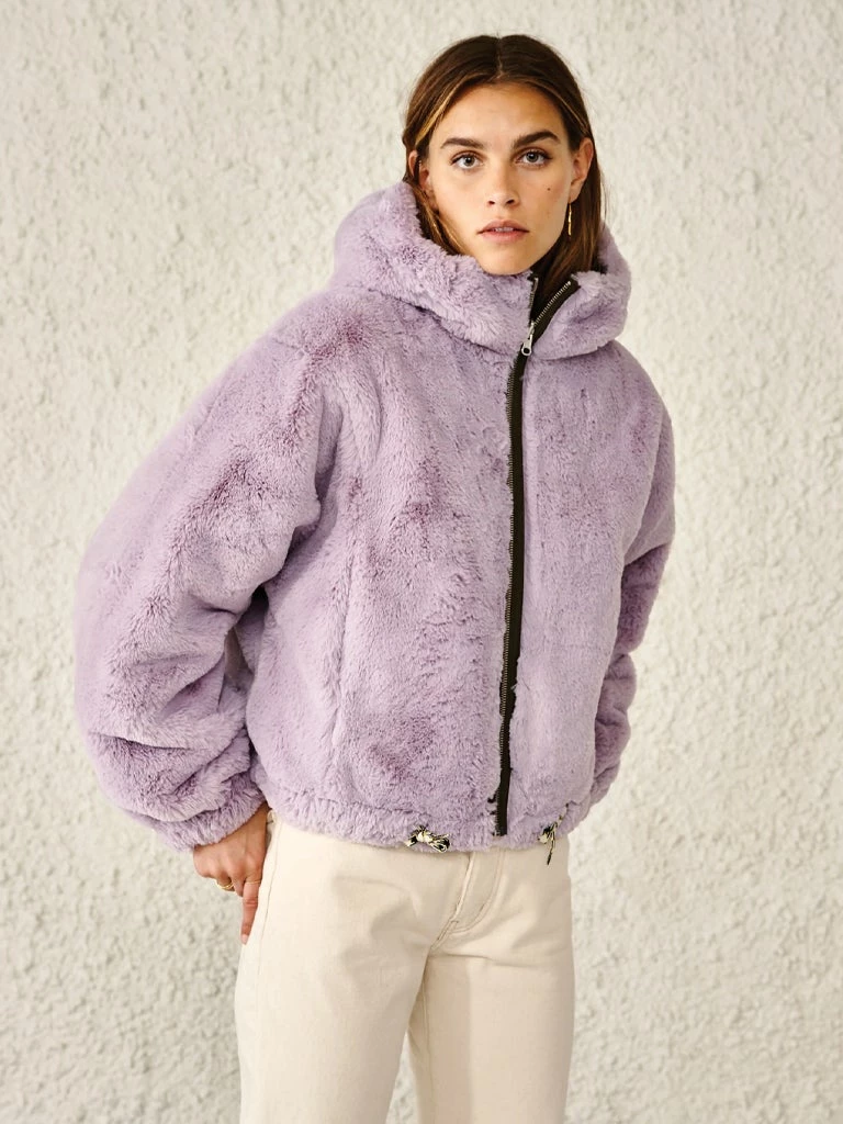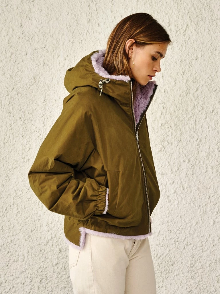 Keep bad weather at bay with this reversible hooded Loud Jacket from Bellerose. Crafted with one side in a water repellent nylon, the other in bright lavender fake fur, it is perfect to enjoy the ever changing spring weather. The jacket is slightly oversized with a cropped boxy cut. Featuring an elasticated waist, contrasting drawstring and zip, elasticated cuffs and waist and a slightly longer length on the back. 72% cotton, 28% polyamide/nylon Lining: 100% polyester/nylon Drawstring: 100% polyester Reversible hooded jacket Water repellent side Elasticated cuffs and waist Contrasting drawstring and zip