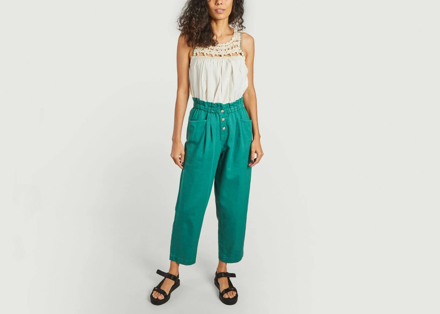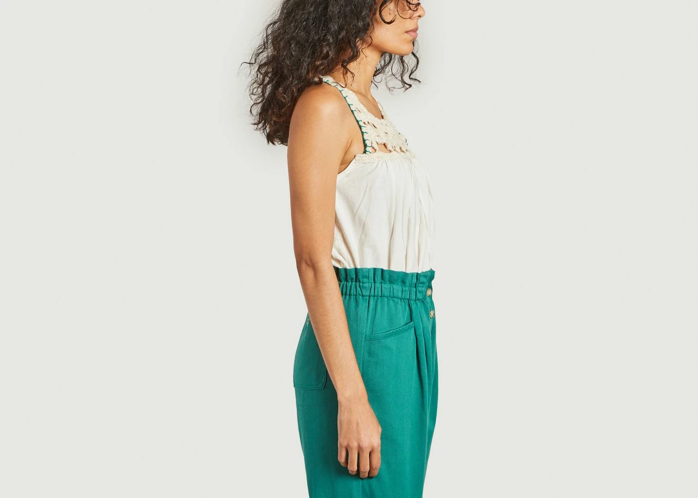 Tank top in ecru color made of cotton. Patterned seams that show the skin at the top of the garment on the front and back. Contrasting green thread on armholes. Fall for this unique and feminine Marles tank top by Bellerose. Pair it with pants in the color of the contrasting thread. It will go very well with a different color that reminds the beautiful weather.