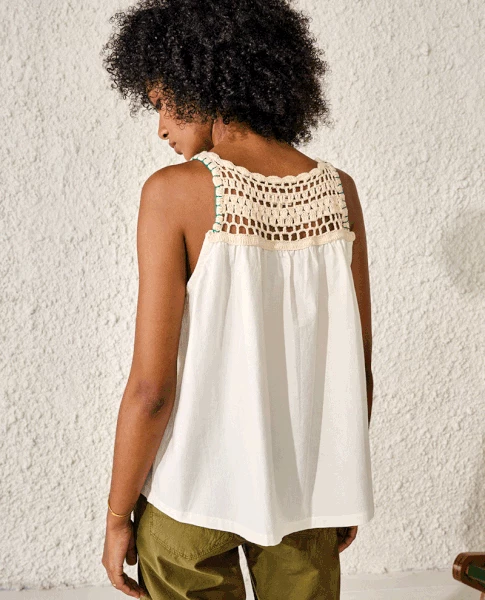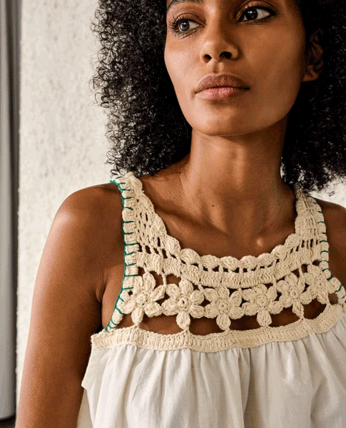 Bellerose Marles Ecru Tank Top, a lightweight natural ecru cotton top with a beautiful crocheted neckline finished with green stitching. Short and boxy this airy sleeveless blouse has a round neck. 100% Cotton Hand wash True to size, size up if between sizes