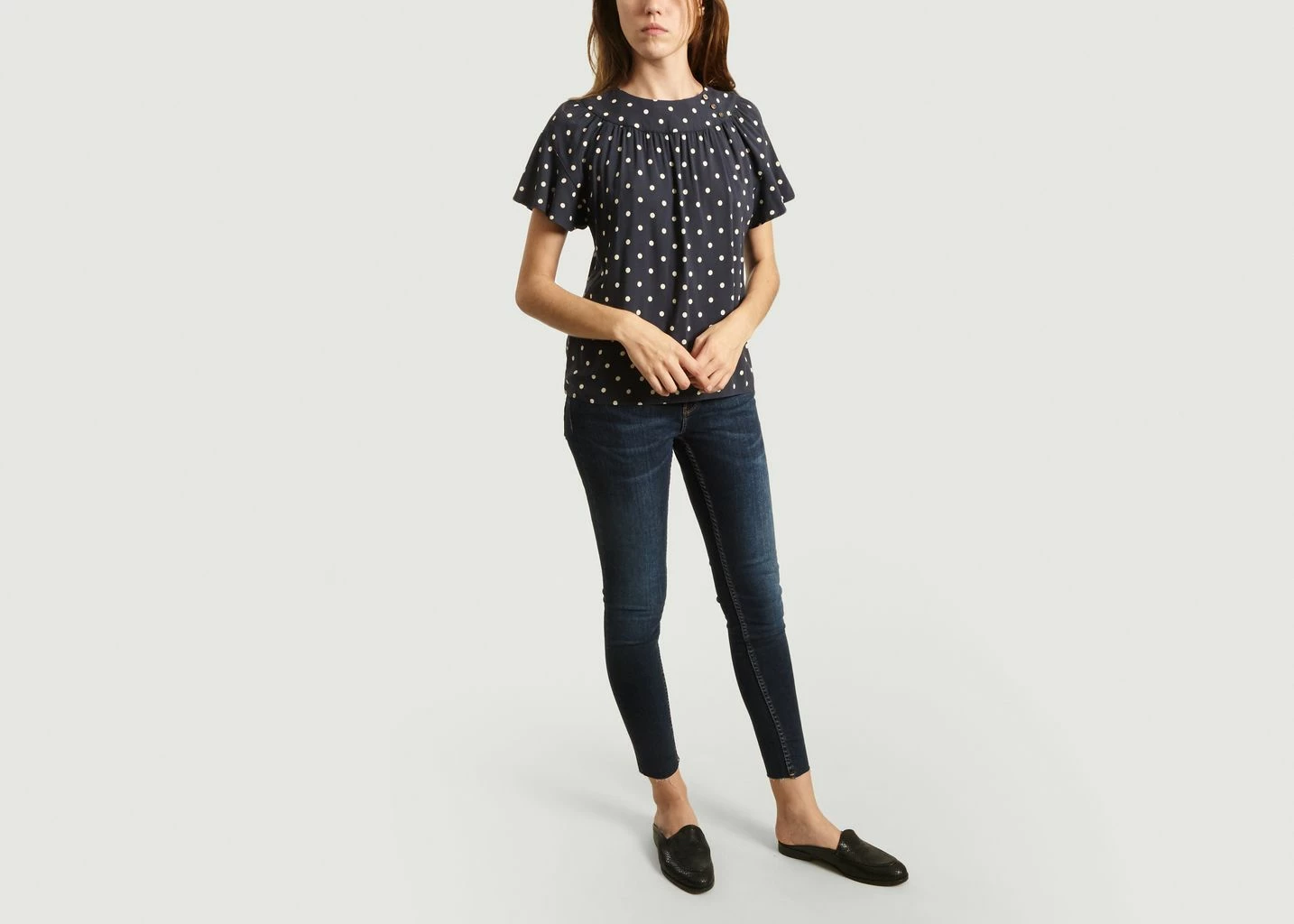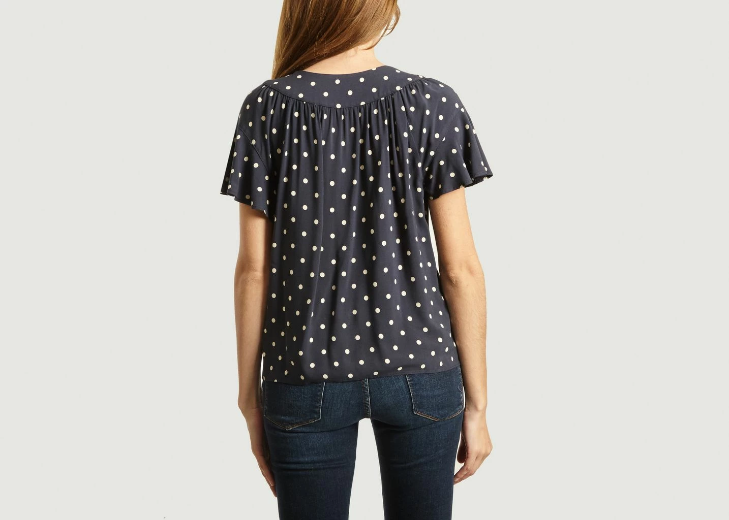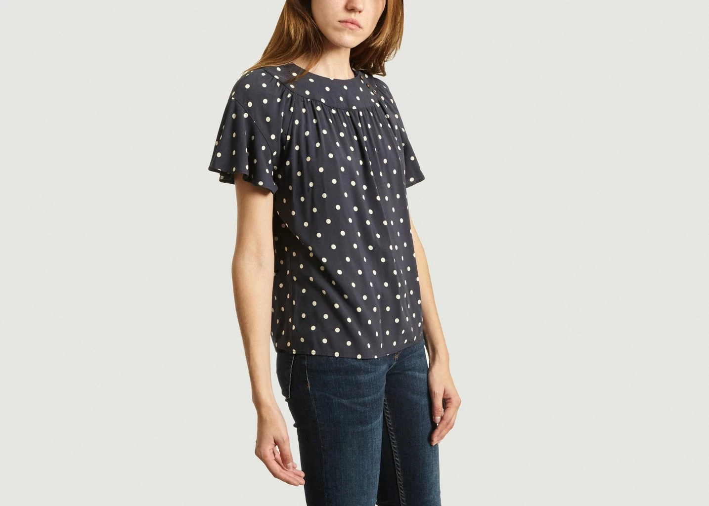 Viscose blouse, straight cut, white polka dots pattern on a navy blue background, short sleeves, round collar in yoke with 3 buttons.