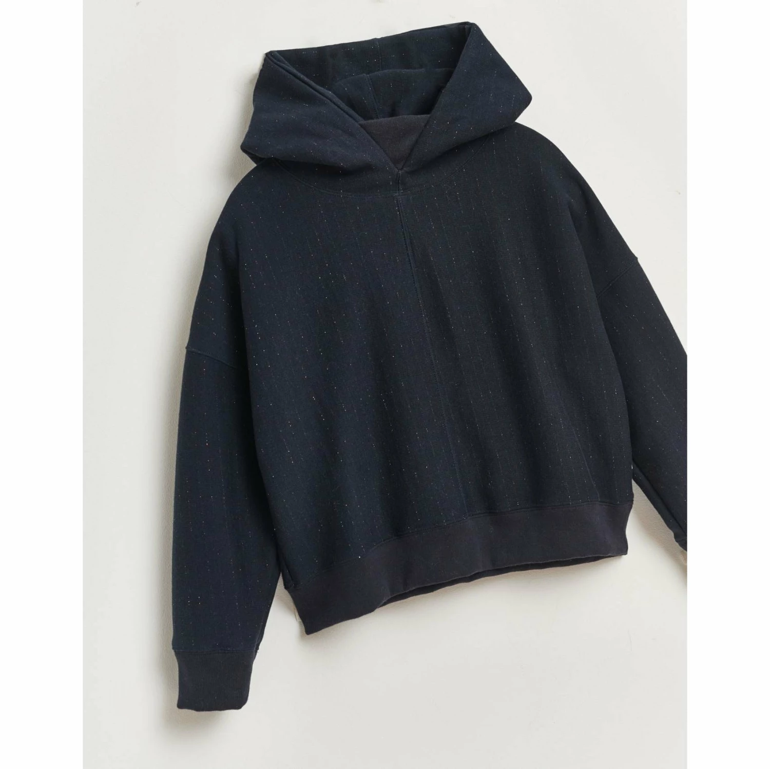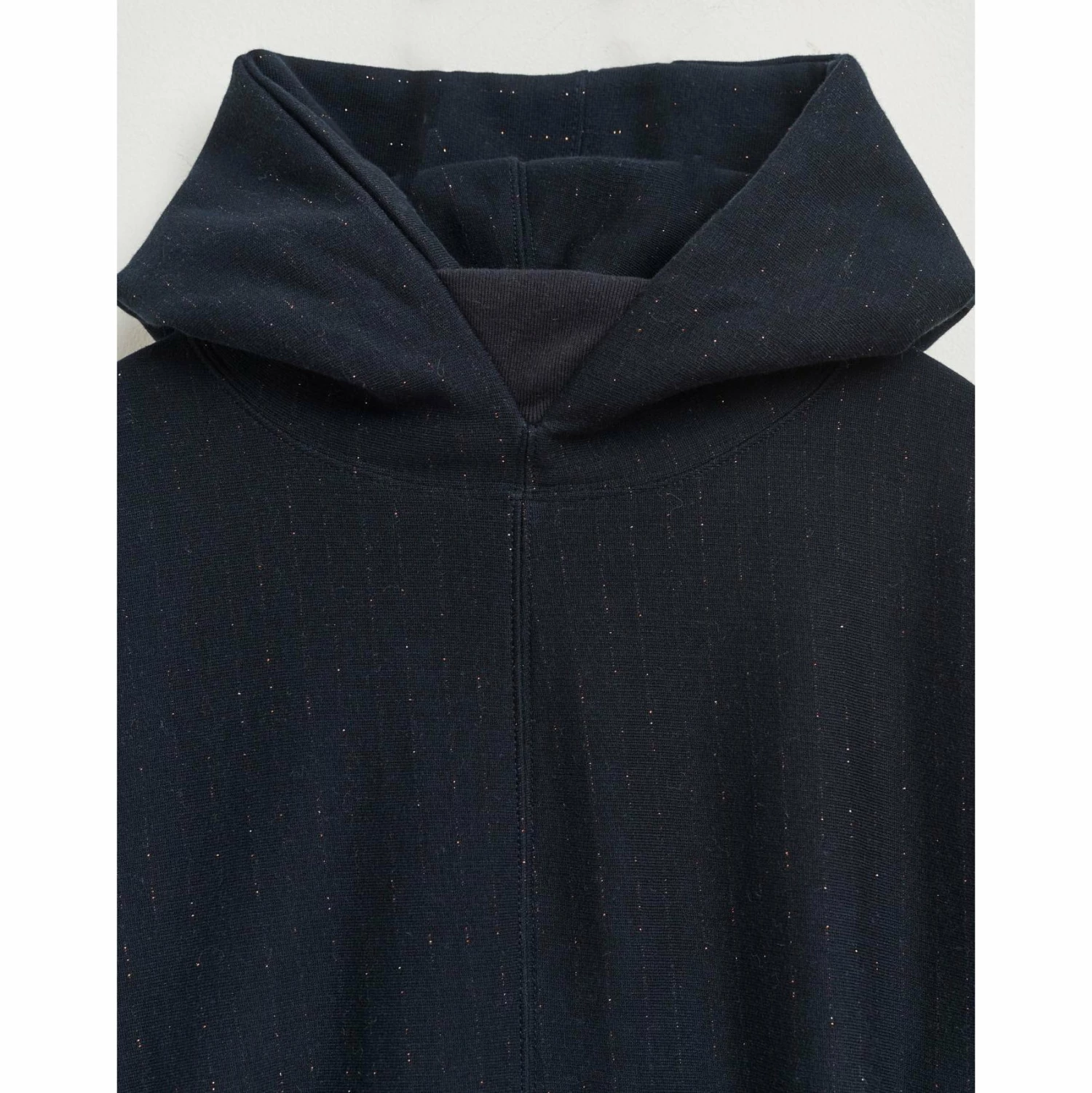 Fabrics: Soft Cotton Details: Navy Blue hooded Sweater, vertical stripe detail in fabrics. Ribbed inside the collar. Composition: 98% cotton, 2% elastane. Colour: America Made in Portugal