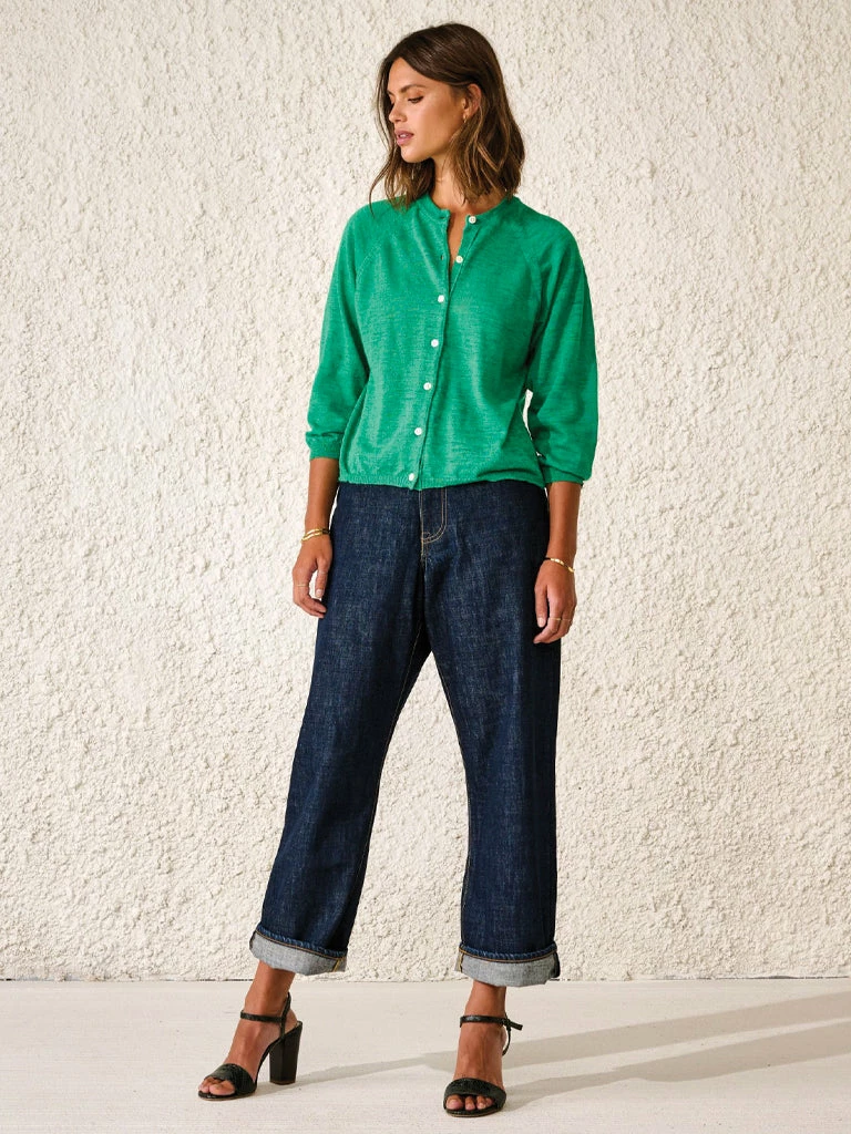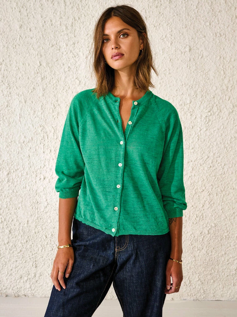 The Neenan Cardigan from Bellerose is crafted from a breathable linen blend. Finished with raglan sleeves, a crew neck, and mother of pearl buttons. 55% linen, 45% polyester Lightweight cardigan in linen blend Raglan sleeves Mother of pearl buttons Handwash cold Do not tumble dry Dry flat away from sunlight
