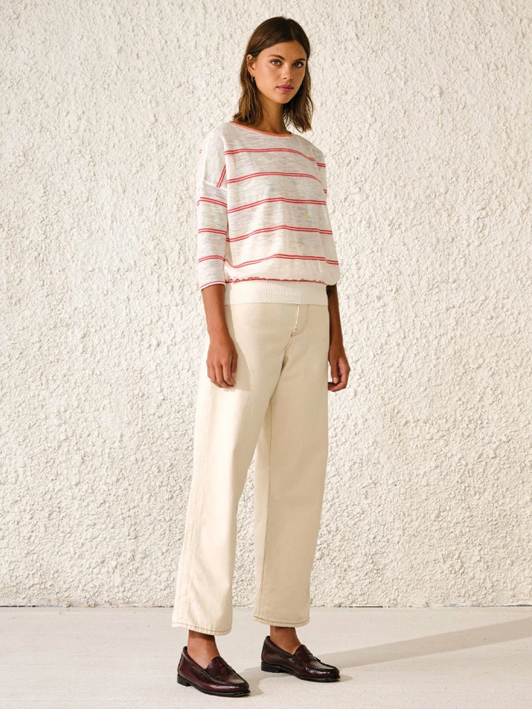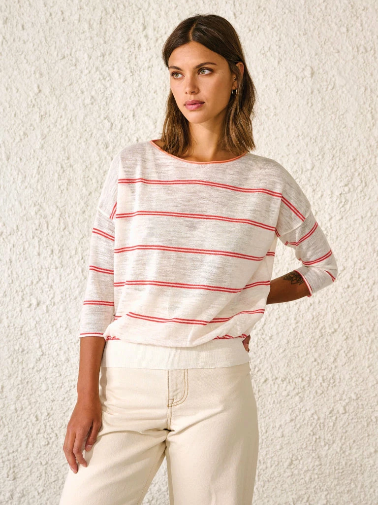 Lightweight and soft on the skin, the Neep sweater from Bellerose is crafted in a delicate Italian linen blend sure is an easy go-to piece for warmer days. Loose and comfy, with dropped shoulders, 3/4 sleeves, and lovely contrasting touch on the collar. 55% linen, 45% polyester Lightweight sweater in linen blend with 3/4 sleeves Handwash in cold water only Dry flat away from sunlight