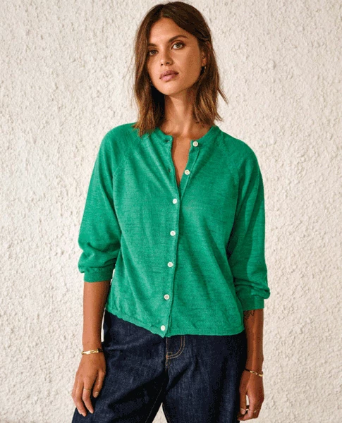 Bellerose Nenna Jungle Knit, a bright emerald green cardigan knitted from a light and Summery linen blend. Designed with 3/4 length puffed sleeves and a round neck this relaxed fitting green cardigan fastens down the front with mother of pearl buttons. 55% Linen & 45% Polyester Hand wash cool and dry flat True to size