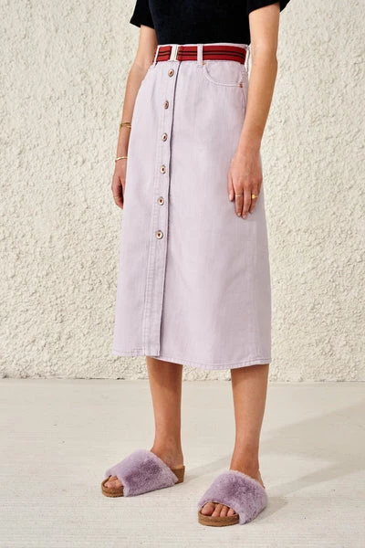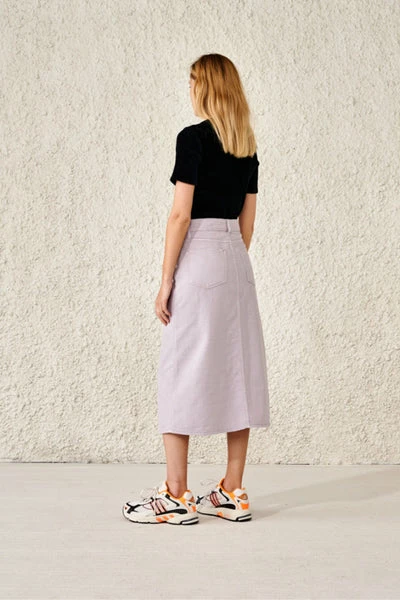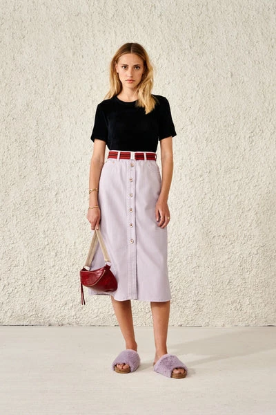A fresh take on the denim skirt. The PALOMA is a good way to keep things easy-going but high in style. Crafted from pure cotton denim with a 5 pocket style, midi length, and button front, it’s a year-round staple you simply can not do without. Bellerose positioned the back pockets a little higher for a more flattering line. Wear yours with a light sweater in spring, a shirt to transition, and a silky tank top for a fresh and polished—but oh! so cool! —high summer look. Especially in this iris tone. High rise denim skirt 5 pocket style Button front 100% Cotton Machine wash at 40°C Do not bleach Do not tumble dry Iron at medium temperature / Heat 150°C Do not dry clean