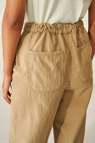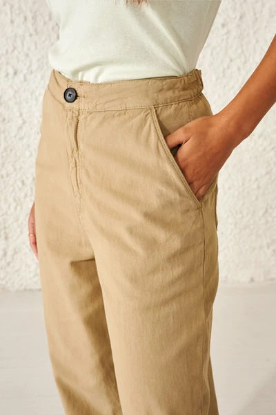 The PASOP checks all the boxes to be the ultimate easy-does-it pair of pants this season. Relaxed cut with a front tailored like classic high rise pants but an elasticated waist in the back for comfort, ankle-length, and straight leg. Wear it as-is with a light sweatshirt and a pair of All-Stars or roll the cuffs to draw attention to your footwear. You’ll love to use this clay version as a base for a tonal look. Model: Ehlana is 177 cm tall and wears a size 1 85% Cotton, 15% Linen Machine wash at 30°C or lower Do not bleach Do not tumble dry Iron at medium temperature / Heat 150°C Dry clean Please note that these were garment-dyed, so some of the color may come off when you wear and wash it first. Relaxed pants Elastic waist Front zip Slant side pockets
