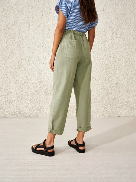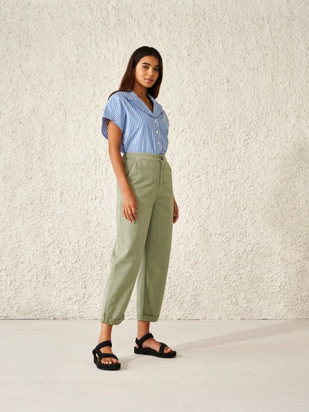 Relaxed high-rise trousers with tailored front and elasticated in the back for comfort. The Pasop are ankle-length and straight leg, they are crafted in a blend of cotton and linen and comes in a soft olive green they call Veronese. Wear it as-is or try rolling the cuffs. Sizing: 0 (XS) 1 (S) 2 (M) 3 (L) 4 (XL) 100% Cotton Made in Tunisia Machine wash at 30°C or lower Do not bleach Do not tumble dry Iron at medium temperature/heat 150°C Dry clean