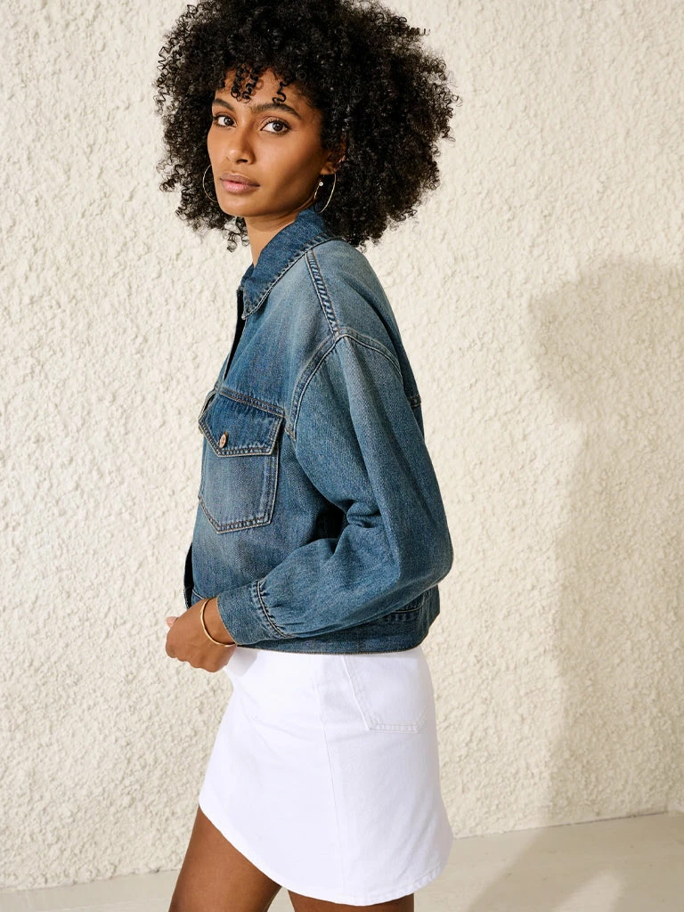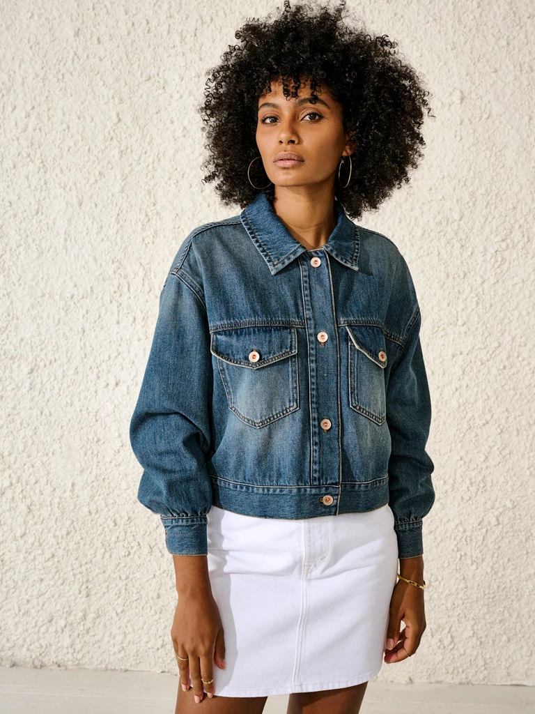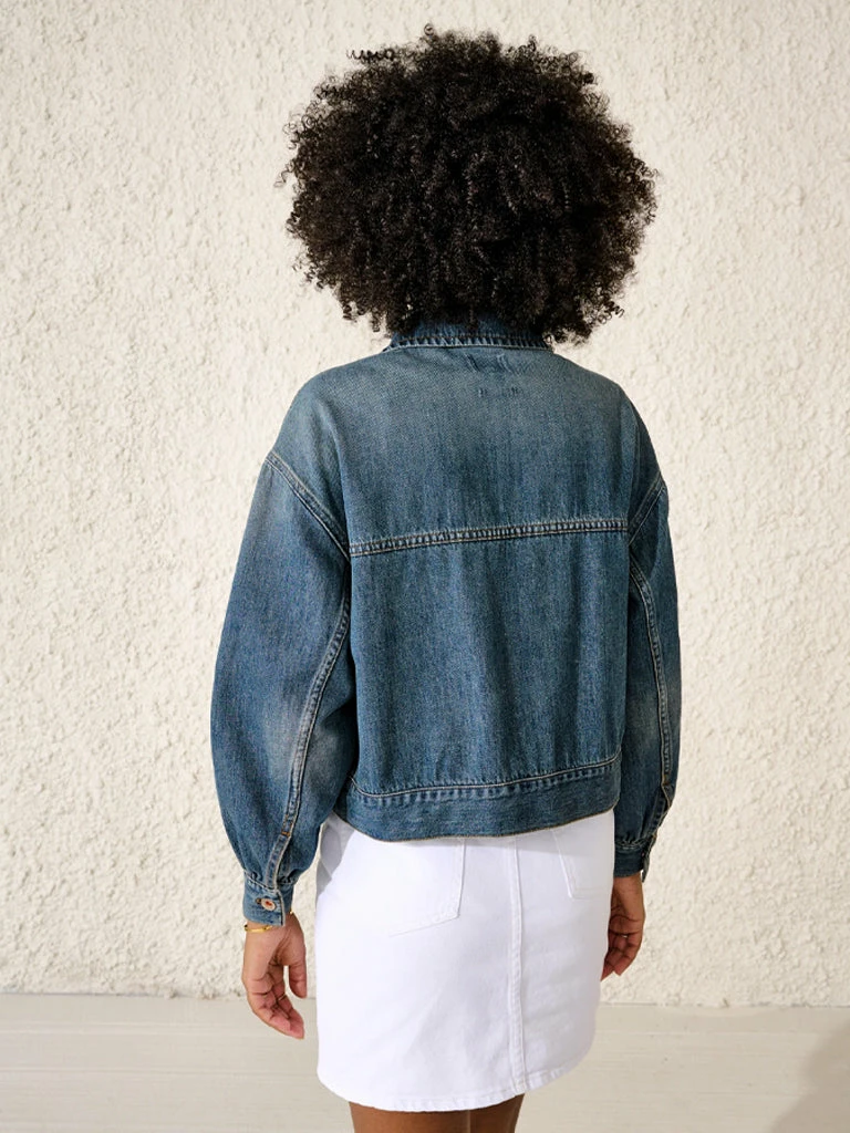 The Paulo Jacket from Bellerose is a cropped denim jacket with a slightly oversized fit. Crafted from 100% cotton denim in a used blue wash, the jacket has puffed sleeves, metal buttons, and two front patch pockets. 100% cotton Cropped denim jacket with puffed sleeves and metal buttons Two front patch pockets Puffed sleeves Used blue wash Machine wash cold Do not tumble dry