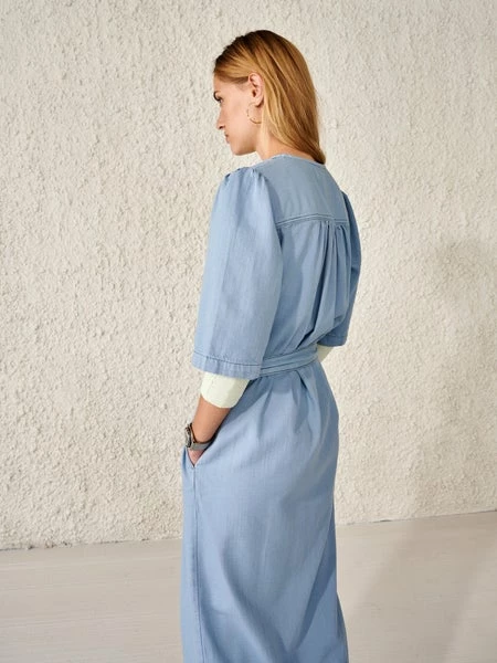 Practical and versatile, this one is characterized by V-neckline, elbow-length sleeves, Contrasting stitches, and a self-tie belt to define the waist and balance the line. Crafted from pure cotton denim, it is available in sun-faded colors or timeless white. Wear yours with a pair of Santiago boots to dive into neo-western vibes or opt for sandals on a sunny day.