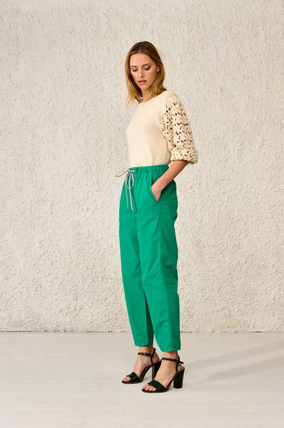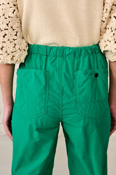 These are the kind of trousers you’ll crave come summer (and in actual fact what most Hambledoners delight in all year round). Easy going and easy fitting, the Pizzy pants will become your best friend as soon as temperatures rise. Featuring an elasticated waist with a contrasting drawstring and a tapered leg, we like to style these with a ribbed tank top, a worker’s jacket and the cuffs rolled up. – Bright emerald green colourway with lilac drawstring – Relaxed fit – 100% lightweight cotton – Elasticated waist – 2 side pockets – 2 back pockets, 1 buttoned Size Conversion: XXS/0, XS/1, S/2, M/3, L/4